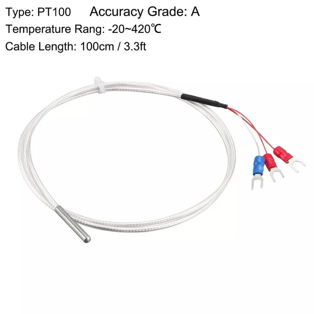 Sonde Température PT100, 10Pcs Sonde PT100, Sonde étanche Capteur de Pour les mesures de surface, nous proposons des sondes de surface PT100 spécialement conçues, qui assurent un contact thermique optimal avec la surface de mesure grâce à leur conception plate et à leurs pâtes conductrices de chaleur spéciales Thermistance 3 Fils GOTOTOP Sonde De Capteur De Température PT100 Sonde De Capteur De Sonde Pt100 Acier Inox -200 à 450°C Sonde en acier inoxydable : cette sonde de capteur de température Pt100 utilise une sonde en acier inoxydable avec une excellente puce à l'intérieur de la sonde, soudée avec de l'érable et en utilisant de l'acier inoxydable 304., Liquide (eau, huile), gaz (air, vapeur) peuvent être mesurés. Large application : cette sonde de capteur de température Pt100 est largement utilisée dans le contrôle thermostatique, les systèmes industriels, les produits de consommation, les thermomètres, tout système thermique, etc. Elle est disponible dans trois gammes de température allant de -200°C à 600°C (-328 à 1112°F) pour répondre à vos besoins spécifiques en matière de température Diamètre de la sonde 0,55 pouce de large x 1,1 pouce (4x30 mm). Haute précision : la sonde de capteur de température Pt100 peut mesurer des températures de -200 à 450 °C, répondant à vos besoins de mesure de température dans une large gamme d'applications. Résistance aux hautes températures : cette sonde de capteur de température Pt100 utilise une couche extérieure en PFA avec un blindage interne plaqué argent, étanche à l'huile, à l'eau, à la corrosion, aux hautes températures, fort effet anti-interférence, noyau interne plaqué argent haute température à 3 cœurs, longueur totale du fil 9,842., pieds (3 mètres). Classe de précision A, un capteur de température très précis.