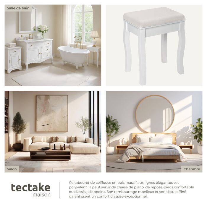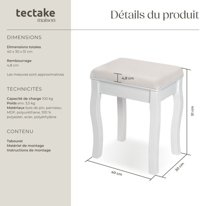 Des instructions d'assemblage claires sont fournies, chaque composant portant une étiquette avec un numéro de série. Coiffeuse Bois Tabouret De Coiffeuse, Chaise Rembourrée De Maquillage, Repos-Pieds, Patins Antidérapants, Pour Chambre, Dressing, Entrée, Blanc - Maison Tabouret Assemblage Facile Caractéristiques : Couleur : Blanc Matériau : PU, Panneaux d'aggloméré, Sponge Dimensions du Produit : 30 × 40 × 44 cm Poids du Produit : 5,9 kg Livraison : 1 x Tabouret de Coiffeuse 1 x Kit d'accessoires 1 x Manuel d'instructions Chaise en velours pour chambre, chaise de coiffeuse avec pieds en chêne Il constitue un siège fiable pour vos routines de beauté quotidiennes Facile à Nettoyer : le tabouret de coiffeuse est recouvert de cuir synthétique et de panneaux de bois blancs. Sweetcrispy Tabouret de coiffeuse avec rangeent, chaise ottoane en fausse fourrure douce... Stable et Robuste : Fabriqué à partir de panneaux de particules robustes, ce tabouret de coiffeuse est conçu pour durer et peut supporter jusqu'à 120 kg. Assise Confortable : Le simili cuir épais et le coussin rembourré moderne offrent une assise confortable, tandis que la hauteur du tabouret de coiffeuse est conçue de manière ergonomique. Sa texture est lisse et agréable au toucher, tout en étant facile à nettoyer, un simple coup d'éponge suffit pour lui redonner son aspect d'origine, Plus besoin de vous soucier de salir le tabouret, l'entretien quotidien est un jeu d'enfant Coiffeuse Avec Tabouret De Coiffeuse, Avec Miroir Et Lumière, Prise De Courant Largeur De 90 Cm Chaise Rembourree Blanc Nuage Et Rose Bonbon 96143214 Ce tabouret de coiffeuse s'adapte à vos différents scénarios d'utilisation Assemblage Simple : Ce tabouret de coiffeuse est de conception simple et ne nécessite que quelques étapes pour être assemblé.