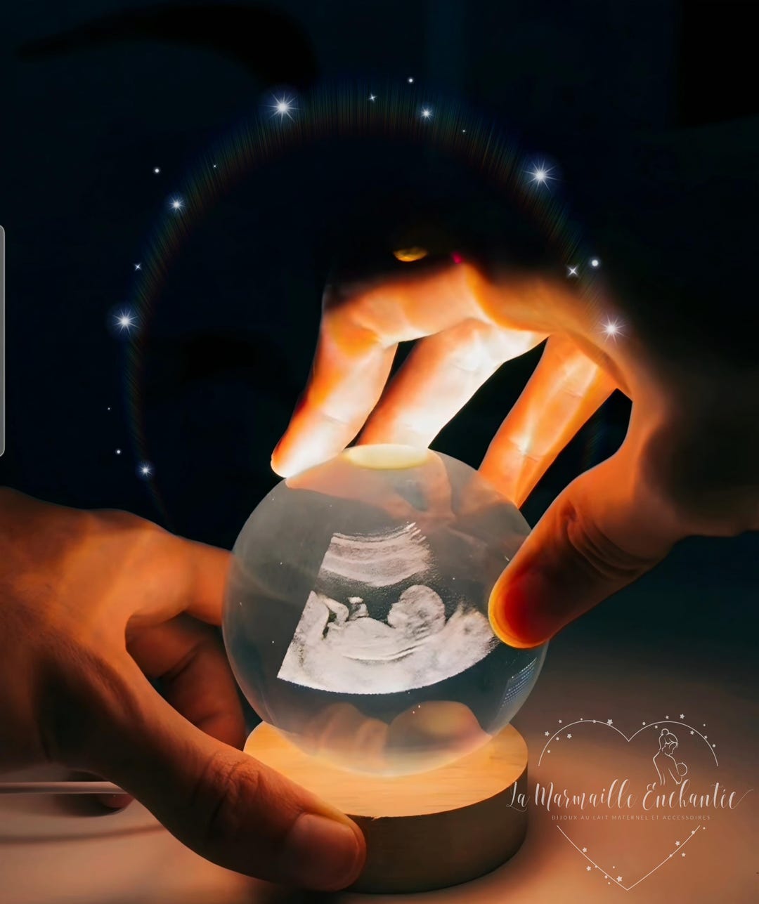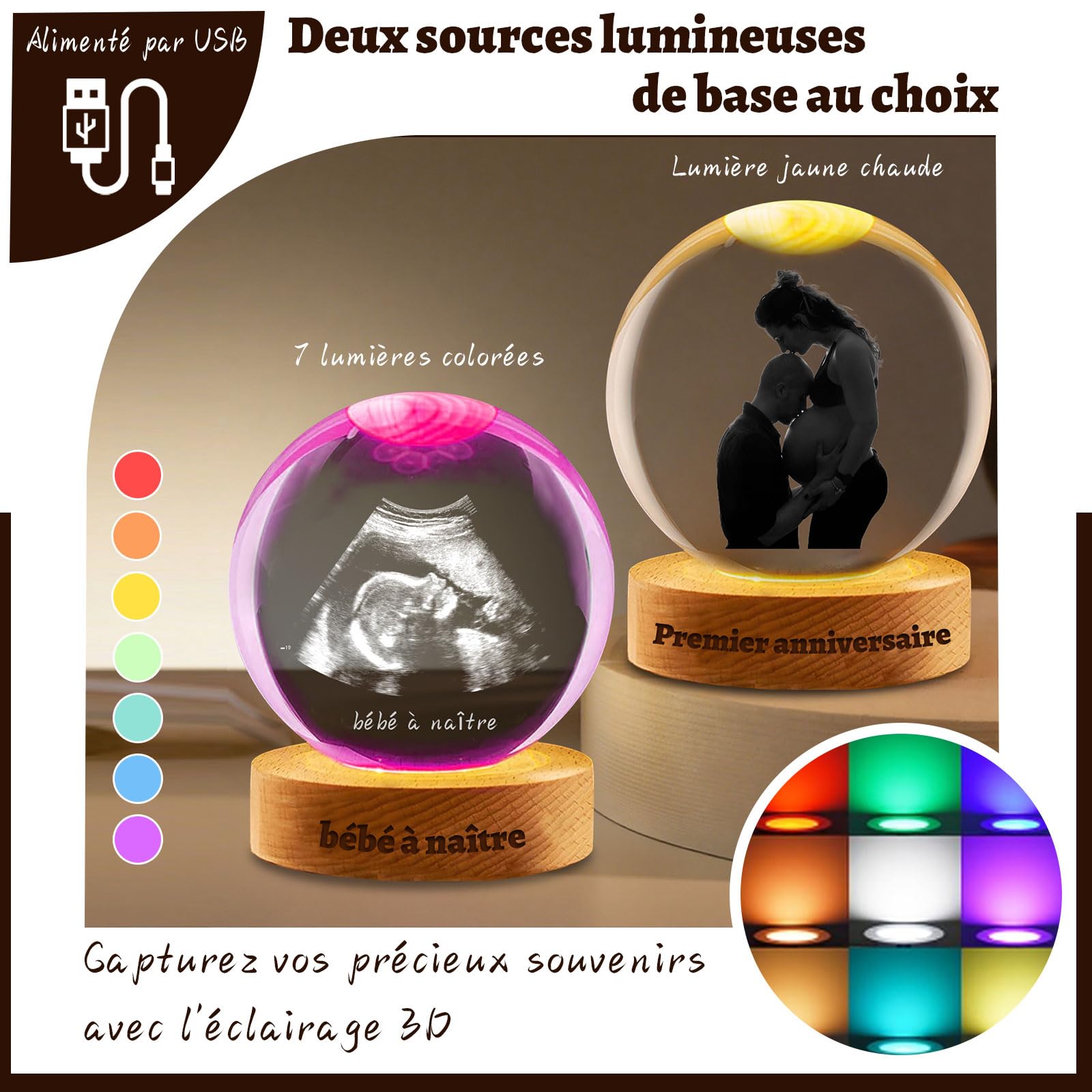 Boule de cristal 3D personnalisée à ultrason B, boule de Cristal ultrasonique personnalisé : Créez une atmosphère chaleureuse et poétique avec cette boule photo boule de cristal. Gravure Ultrason Boule De Cristal Personnalisée Avec Photo, Gravule Nom/Texte Boule Photo 3D La base en hêtre massif est gravée au laser avec une technologie de pointe pour créer un effet 3D clair et détaillé. No Du Cristal Porte No Ou enu Cristal Swarovski Cristal | Antikeo Objet personnalisé pour anniversaire : Créez un cadeau unique et... Boule photo en cristal 3D personnalisée : Nos boules lumineuses à échographie sont parfaites pour annoncer une grossesse, surprendre les futurs grands-parents ou créer un souvenir inoubliable. Nos boules de cristal ultrasoniques avec noms sont parfaites pour une chambre d'enfant, un bureau ou une table de chevet pour créer une atmosphère chaleureuse. Cadeaux photo personnalisés : Quelle que soit la fête – anniversaire, Noël, Saint-Valentin, mariage ou Fête des Pères – cette boule lumineuse avec photo est le cadeau personnalisé touchant qui fera sensation. Nous pouvons non seulement graver au laser vos précieuses échographies 3D, portraits de famille, photos d'animaux ou moments de mariage sur la lampe à échographie personnalisée avec une netteté exceptionnelle, mais vous pouvez également personnaliser le socle en hêtre avec des noms, des dates ou un message spécial. Cette boule de cristal à ultrasons peut apporter plus de moments touchants et de surprises aux futures mamans. Boule de cristal photo 3D personnalisée pour échographie B : immortalisez leur première échographie dans notre boule de cristal personnalisée.