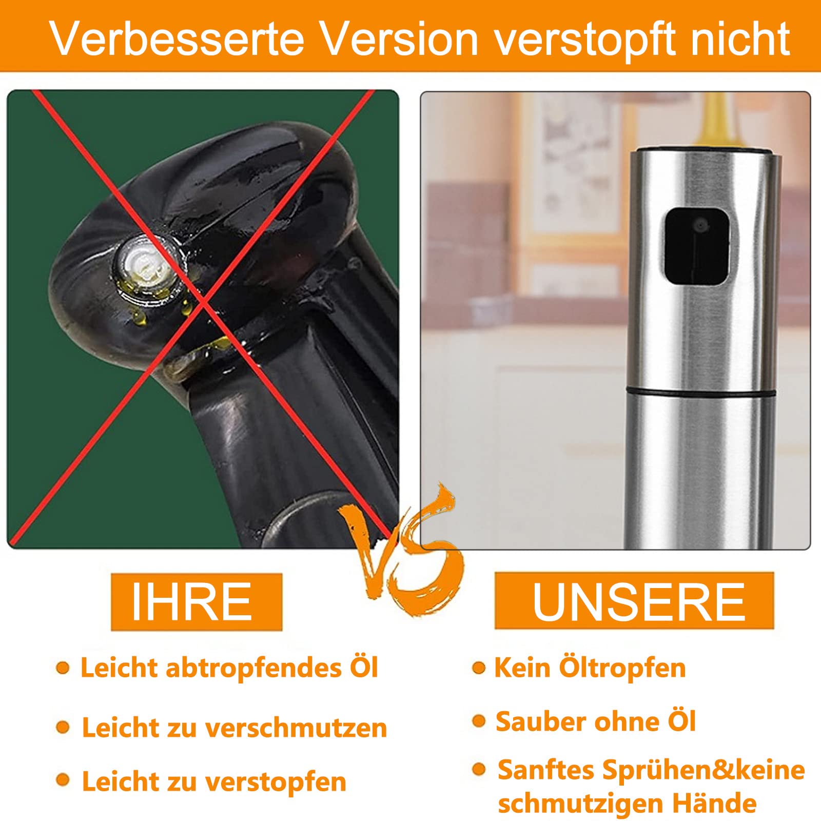 PORTENTUM Pulvérisateur d'huile Premium pour cuisine et friteuse d'air 300 ml Spray Cuisine Anti Le noir - Pulvérisateur'huile'olive pour barbecue, 2 pièces... Spray Huile Vaporisateur DHuile De Cuisson En Acier Inoxydable 304 Rechargeable Vaporisateur Cuisine Huile Détails Couleur : argenté Matériau : acier inoxydable Dimensions : 17,5 x 4 x 4 cm Utilisation : pour la cuisine, les salades, le barbecue, les pâtes, etc. Grâce au principe d'atomisation de pression, à la buse améliorée, à l'échelle précise et à la mesure précise, vous pouvez facilement contrôler la quantité d'huile avec la bouteille d'huile TOOAD Spray Huile, Vaporisateur Huile pour Friteuse a Air 100ML Spray... 【Matériaux sûrs】 l'atomiseur est fabriqué en acier inoxydable de haute qualité, sans BPA, durable et respectueux de l'environnement. 【Facile à utiliser】 remplissez simplement vos huiles préférées dans le récipient et appuyez sur le pulvérisateur pour libérer un jet d'huile uniforme dans le goût de votre choix pour un repas plus sain sans se salir les mains. 【Design bec verseur 】 le pulvérisateur a un bec verseur fileté pour un joint antidérapant et aucune fuite d'huile, facile à nettoyer et portable 【Design parfait 】 taille parfaite (capacité de 100 ml, hauteur 175 mm/6,88 pouces x diamètre 40 mm) pour ajouter votre huile préférée, vinaigre, jus de citron et de citron vert, sherry ou marsala.