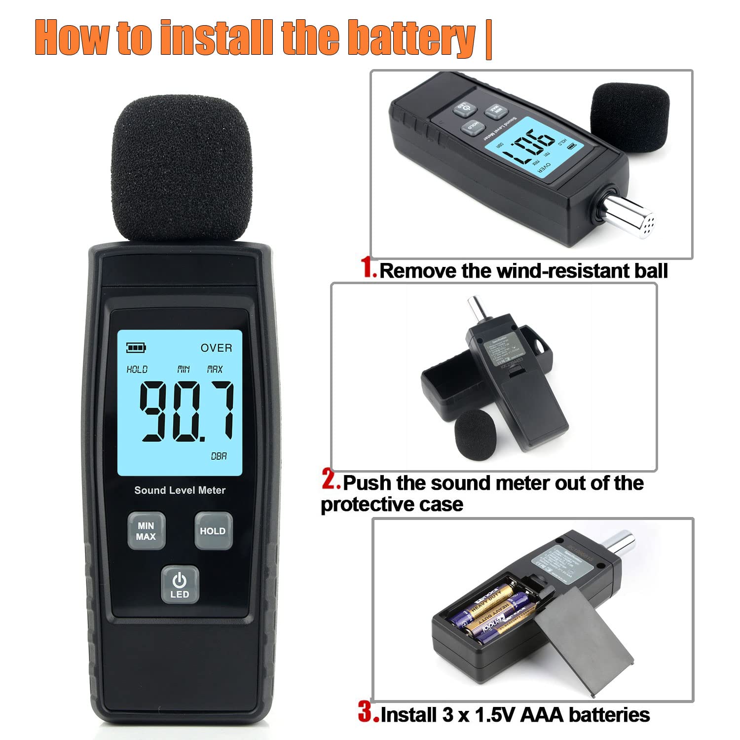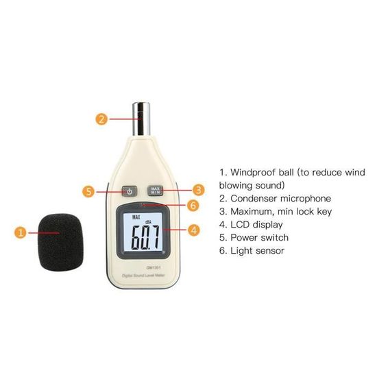 Minifinker Décibelmètre Compteur de décibels Gamme de 30 à 130 DB Mesure précise: Ce compteur offre une plage de mesure de 30 à 130 dB avec une précision de ±1,5 dB à 94 dB et 1 kHz et une résolution d'affichage de 0,1 dB. Cette précision le rend adapté aussi bien aux environnements professionnels qu’aux conformités réglementaires Sonomètre Enregistreur Benetech Compteur De Décibels, Moniteur De Niveau De Décibels Sonomètre Numérique 30-130 DB écran LCD DB mètre pondéré A/C : le décibelmètre utilise un microphone à condensateur pour mesurer les niveaux sonores allant de 30 à 130 dB (A)/35 à 130 dB (C), avec une précision de ± 1,5 dB, et couvre les fréquences de 31,5 Hz à 8 500 Hz Vous pouvez basculer entre la pondération rapide/lente ou geler la lecture actuelle selon vos besoins. L'échelle des décibels du niveau sonore Vecteurs Et Illustration, Image... Facile à lire : l'écran LCD rétroéclairé du sonomètre affiche visuellement les données de bruit changeant la valeur maximale. En outre, vous pouvez définir la date, configurer un temps d'arrêt automatique et un indicateur de batterie faible pour vous rappeler quand il est nécessaire de recharger (Remarque : le db mètre est bien calibré avec la norme de 94 dB @ 1 kHz en usine avant expédition., ) Léger et durable : ce testeur de niveau sonore dispose d'une poignée en caoutchouc antidérapant et ne pèse que 120 g, ce qui le rend pratique à transporter.