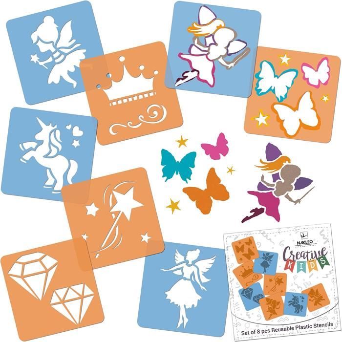 Cette conception soignée assure la sécurité des enfants et la tranquillité d'esprit des parents. Création Artistique : Ce coffret de pochoirs offre une variété de techniques créatives. La découpe des modèles facilite la création d'œuvres d'art, qu'elles soient plates ou tridimensionnelles. Aucune compétence professionnelle en peinture n'est requise pour intégrer facilement ces éléments fantastiques à vos œuvres. NAKLEO Pochoirs de Dessin pour Enfants 8 Pcs 15x15cm Sirènes Ainsi, les pochoirs peuvent être réutilisés à maintes reprises, offrant une valeur pratique et répondant à vos besoins créatifs à long terme. Ces motifs non seulement éveillent l'imagination, mais constituent également une riche source d'inspiration pour vos créations. 8 pochoirs à dessiner pour enfants - 15x15cm - Pirates - Plastique réutilisable et lavable - Set de pochoirs pour l'art et le bricolage. 10,95... Ils sont parfaits pour créer des cadeaux personnalisés ou organiser des fêtes. Design Thématique : Ce coffret de pochoirs propose huit motifs oniriques inspirés d'éléments classiques des contes de fées, comme des licornes, des papillons, des fées et des couronnes. Choisissez parmi une variété d'outils de peinture pour répondre à vos envies créatives : Les pinceaux permettent une coloration détaillée, créant un effet traditionnel peint à la main ; la peinture en aérosol crée des dégradés modernes et des effets flous. Gabarits Peinture Réutilisables 64 PCS ENFANT Pochoirs De Dessin Pour Enfants Anti-stress Bricolage EUR Pochoirs Enfants Contes De Fées DES ENSEMBLES THÉMATIQUES DE 8 POCHOIRS CHACUN : Chaque emballage contient 8 pochoirs de couleur bleue et orange mesurant 15x15 cm, soigneusement conçus et regroupés en sets thématiques de motifs tels que les animaux, Noël, la Saint-Valentin ou les fées Applications : Ces modèles offrent un large éventail d'applications.