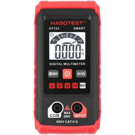 Caractéristiques : Détection NCV : en mode NCV, rapprochez progressivement la sonde de détection NCV de l'instrument de la zone testée. Résistance : 2 000 Ω/20 kΩ/200 kΩ/2 000 Ω/20 Ω, ± (1,0 % + 3)., Nombre : 2000., Affichage : HTN. Indicateur de batterie faible : lorsque la tension de la batterie est inférieure au niveau de fonctionnement normal, le coin supérieur droit de l'écran affiche un symbole pour rappeler à l'utilisateur de remplacer la batterie. Lorsque l'instrument détecte un signal de champ électrique fort, le rétroéclairage rouge s'allume, et il émet un bip sonore rapide, tandis que l'écran affiche « --H » Portée automatique : lorsque l'instrument est réglé en mode automatique, il identifie automatiquement les signaux de mesure de tension, de résistance et de continuité. Dimensions : 136,2 x 44,5 x 32 mm (longueur de la ligne 60 mm). Gamme automatique/manuelle : automatique. Appareil Mesure Tension Résistance Ultiètre De Digital Autoatique Portatif De Gae Avec Le Voltètre De C.C à C.A. De Esure Avec Lampe Torche LED HT93 Multimètre numérique portable multifonction avec Tension CC : 2 000 V/20 V/200 V/600 V, ± (0,5 % + 3). Lorsque l'instrument détecte un signal de champ électrique faible, le rétroéclairage vert s'allume, et l'écran affiche « --- L ». 【Détection NCV】Le mode NCV permet une détection sûre des signaux de champ électrique faibles et forts. Lampe de poche LED : pratique pour une inspection et une mesure minutieuses 8. Arrêt automatique : l'instrument s'éteint automatiquement dans les 15 minutes... Arrêt automatique : l'instrument s'éteint automatiquement dans les 15 minutes sans opération pour économiser la batterie. 【Éclairage de la lampe de poche LED】Équipé d'une lampe de poche LED, le multimètre facilite l'inspection des points de contact, ce qui le rend pour une utilisation dans des environnements faiblement éclairés. Contenu du paquet : 1 multimètre intelligent HT93., 1 stylo de détection. Multimètre numérique HT123, multimètre à plage automatique, 2 000 points, mesure True RMS... Portée automatique : avec le mode automatique, le multimètre identifie automatiquement les signaux de mesure de tension, de résistance et de continuité, offrant commodité et efficacité pour différents scénarios de test. Arrêt automatique : pour économiser l'énergie de la batterie, le multimètre s'éteint automatiquement après 15 minutes d'inactivité, prolongeant la durée de vie de la batterie et améliorant l'efficacité. Éclairage de la lampe de poche LED : la lampe de poche LED permet une inspection étroite des points de contact, ce qui la rend pratique pour les mesures de sonde.