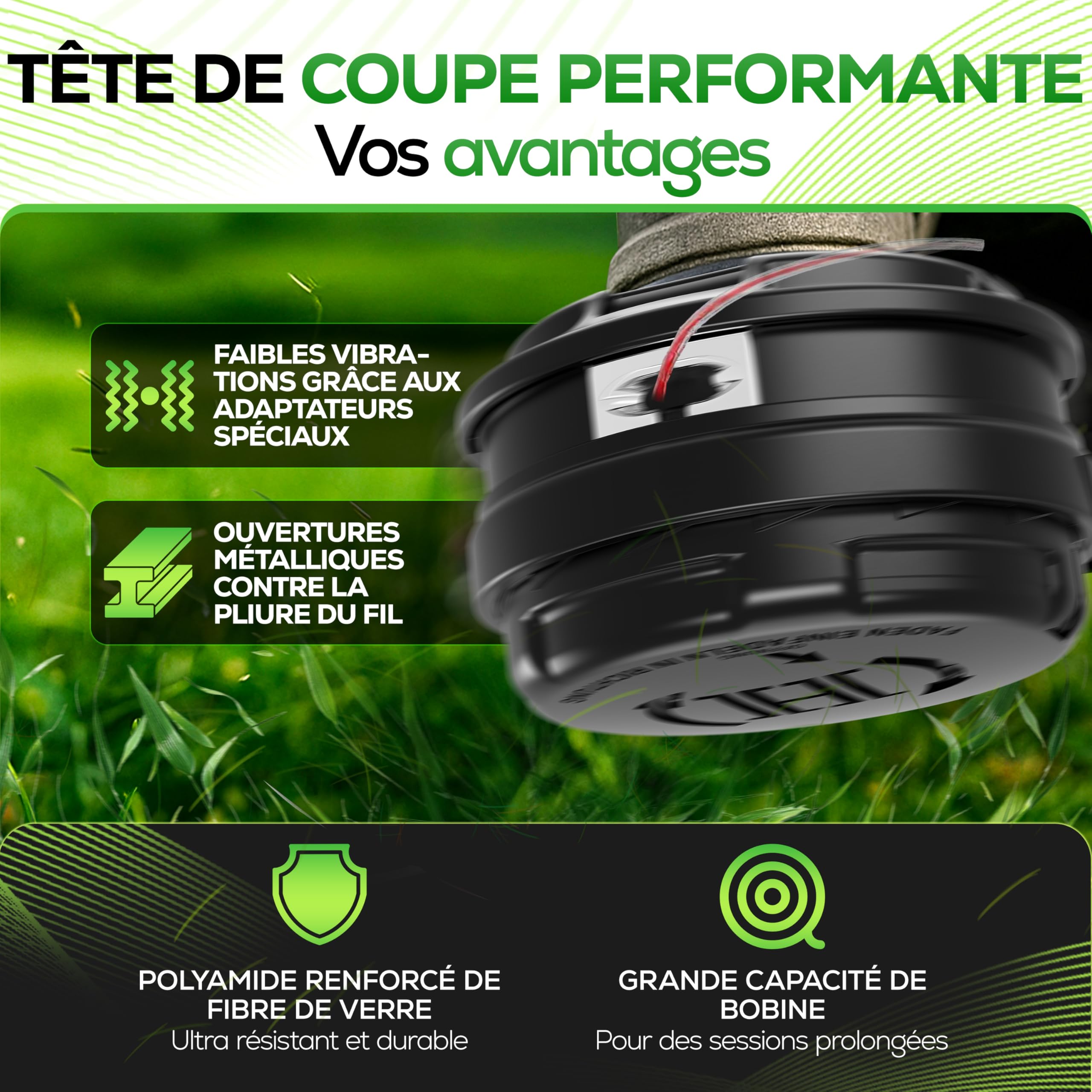 Les modèles suivants que nous avons testés conviennent entre autres ; une grande variété d'autres modèles s'adaptent également, mais ne sont pas mentionnés ici. MARUYAMA : BC200C, BC260, BC260H, MC260, MC260S, BC184, BC184C, BC220DE, BC230, BC241, BC326, BC330, BC402, BC480, BC331BK, MB100, MB250, MB300, MB400., 0, MB50., 0,BC2321 MC CULLOCH : 100A, 90/A, 95A, 99A, EB3, MAC80, MAC85A, MAC90, MAC90A, MAC95A, PS1, PS2, PS3, PS4, PS5, SEB4, SM100, SMAC30AV, SMAC38AV, SMAV38AV, MAC22/23/300., 38, 80 P30AV, DELTA, MS33, MS40, MAC22, MAC23, MAC30, S'MAC30AV, TD2400, TD3300, TD4000 OLEOMAC : TR60E, TR61E, TR91E, TR100E, TR101E, 720, 725B, SPARTA26TR, SPARTA25TR, 200, 220, 260, 300, 310, 400, 410, 433BP, 435BP, 440/BP, 446BP ERGO, 453BP ERGO, 720, 722S, 725B/D/S/T/ERGO, 726D/S/T, 727C/S/T, 730S/T, 733S/T, 735S/T, 740S/T, 746S/T, 750S/T, 753S/T, 755 MASTER,BC220S/T, BC240S/T, BC250S, BC2660 4S, BCC. P, 200 Series -200, 2201C, 260/D, 2601C, 2601CVA, 261/A, 300 Series 300A/AIC, 301, 310, 350, 400 Series 400/AIC, 400A, 410, 450, 460/AVS Machine verte : 1200, 1500, 1600, 1700, 1900, 2000, 2100, 2200, 2331, 2340, 2500, 3000, 3451,4000, 4500 HOMELITE : 8CH38, BCH40, BCH48, PBC3800, PBC4000, HBC30, HBC30B, HBC30C, 38, 40, HK14, HK18, HK24, HK28, HK33, HK38, PCB3600, PCB3600B, PCB3600B, PCB3600B, PCB3600B, PCB3600B, PCB3600B, PCB3600B., Référence : 83600., E, PLT3400, ST155, 175C, 185C, 285C, 385C, ST485, ST485C, BCH32CDI, BCH33, BCH33DI, BCH33TO, BCH33B, BCH40, BCH48, BCH20, BCH24, BCH2D, BCH32C, BCH33, BCH338, BCH33DI, BCH33TO, ST80, ST100, ST120, ST160, ST180, ST200, ST210, ST360, ST385, SXD20, TK518, NBA524, PMB522, TXD508 Honda : UMK422LTE, UMK422UT4E, UMK422LT4E, UH41, SXD-25HE etc. Alpina : 170, 180, 190, 200-ALPINA/CASTOR:210, 220, VIP21, VIP25, VIP30, VIP34, VIP34D, VIP34F, VIP42, VIP35F, VIP52, VIP52D, VIP52F, VIP42D, VIP422D F BLUEBIRD : SBC23E, 27E, NBC31EA, NBC38E, M47, M54 Dolmar : BC337, BC377, N826, NB03, NB04, NB31, NB40, MS3500, NB40, N8411, NB50, NB351, BD330, C250, LT-250, MS340, BC12, BC210, BC212, MS52., 50, BC2., 10, BC212, MS30C, MS30U, BC225, C225, LT225, MS220, MS2300, MS2600, MS3100, LT154, NB, NB01F, NB02, NB16F, NB211, NBF 171, N826, NB31, LT222., 25, LT2., 55, N82, NB271, MS-250, MS3200, MS5200, MS2810, etc. Solo : 123, 125, Multimot, 100, 1305, 014, 119, 400, FS135, FS136, S100, S400, FS125, S200, S300, etc. 280S/T, BC320S/T, BC360 4S/T, BC380S/T, BC420S/T, BC430S/T,BCF420, BCF430,SPARTA25/D/S, SPARTA250S/T, SPARTA26/S, SPARTA37/S, SPARTA370S/T, SPARTA38/S, SPARTA380S/SPARTA380S/ T, SPARTA422 /S/BP, SPARTA44/S/FE, SPARTA440S/T/BP. Débroussailleuse Stihl Heckenpracht® Tête De Fil Pour Débroussailleuse FILET GAUCHE Avec Système Tap & Go | Tonte Efficace Avec Tête De Coupe Pour Taille-haies Avec Fonction Bobine Fil Débroussailleuse Tête pour débroussailleuse Tap and Go Tecomec EW109 Mâle M7x100mm - Jardin 440 g KAAZ - Idéal : JQ, JQ40, JQ50, VRX540, JQG4K, JQT200, KQ30, T170, T240, T410, J400GX, V25, V35, V40, VX360, K40D, K408D, S25, SX230, SX260., 0,TJ2 7E KOMATSU ZENOAH : BC254A, BC260DM, BC260DUM, BC340DWM, BC340FW, BC341DWH, BC431DWM, BC432FWM, BCD20, BCF01, BK245FLK, BK345FL, BK346FL, 8K435FL, BK436FL, BK530DL. La tête de fil s'adapte à toutes les débroussailleuses avec filetage et les mêmes dimensions de filetage des adaptateurs fournis. 500 / 5000 / 500 DH / 501 / 202 TAS TANAKA : SUM3, TCG22EA, TBC162, TBC202, TBC205, TBC215, AST7000 Yamaha : YBC20D, YBC30D, YBC40D, etc. PISCINE EFFICACE AVEC ligne en nylon pour tête de tonte adaptée pour 36 2 46 2 EUR 21,07... 24, GT26D, GT26L, RS44, G25RD, LR200, LR220, LR260, LR300 KAAZ : 410, J40/BD/HD, J400/GX, JLKT200, JLQT200, JQ/40/50, JQG4K, K40D/BD, KQ30/NE, KT10, KT18/15/30, KW30NE, K40D/BD, KQ30/NE, KT100., 18/18 5/30, KW30NE, RQ30/40, RX350/351L, TI70, 240/410, V190/35/40, V420/520, VNX540, VRX360/440/540, VX221/251C/360/360/35., 60S, VX. La qualité se reflète également sur les œillets métalliques de qualité supérieure qui empêchent le fil de se plier. STIHL: FS38, FS45, FS85, FS87, FS95(R)C-E, FS44, FS52, FS56, FS66, FS86, FR106, FS74, FS74R, FESS, FS36, FS88, FR108, FS40, FS76, FS76R, FS106, FS108, FS40., 8, FS52., FS62, FS81, FS96, FS56RC, FS70RC, FS90, FS50, FS51, FS60, FS61, FS65, FS80, FS80E, FS90, FS90AVE, FS96, etc. Tête de débroussailleuse Stihl - Tête Stihl Autocut 25-2, coupe et tonte pour débroussailleuse... Caractéristiques : grâce à notre fonction pratique Easyload, le fil peut être chargé en 30 secondes sans démonter la tête de coupe ou avoir besoin d'outils / accessoires Caractéristiques : grâce aux adaptateurs fournis avec les filetages M8 x 1,25 LHF M10 x 1 LHF / M10 x 1,25 LHF / M10 x 1,25 LHF / M12 x 1,5 LHF / M12 x 1,75 LHF, notre tête à double fil est Avec la plupart des marques telles que Stihl, Dolmar, Echo, Honda, Husqvarna, Shindaiwa et bien d'autres. Husqvarna : 232L, 232LCAT, 32R, 225RJ, 225R, RD, 232R, 232RCAT, 322L, 325LX/XT, 325RJX, 322RJ, 325RX/RXT, 16R, 25R-before 1987-IKRA : BT1045, etc.