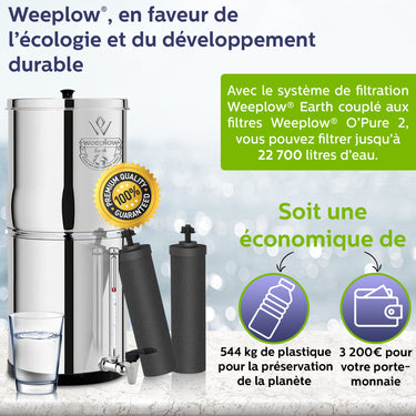 La durée de vie d'une seule cartouche est de 10 000 litres (en fonction de la qualité de l'eau, la durée de vie des cartouches peut être un peu différente). Avantages perfectionnés en plus d'un demi-siècle : Depuis plus de 50 ans, nous nous consacrons à fournir aux familles de l'eau propre. Notre voyage vers l'excellence pure., Efficacité à long terme Filtres durables pour des performances fiables, moins de remplacements et économies. Accessoire Camping Eau Potable Phoenix Gravity - Système De Filtration D'eau Par Gravité AISI 304 De 8 Litres Avec 2 éléments Smart Carbon, 2 éléments D'élimination Du Fluorure, Support Et Robinet En Acier Inoxydable Gratuits Système Filtration Eau 6L Acier Inox Débit élevé : Conçu pour offrir un débit élevé sans compromettre l'efficacité de la filtration. Technologie de filtration certifiée NSF éprouvée : les filtres à eau Phoenix Gravity sont certifiés NSF et testés indépendamment pour garantir une réduction de plus de 99,99 % des contaminants tels que les bactéries, les virus, le chlore, les métaux lourds, les microplastiques, le PFAS, et bien plus encore. Les cartouches filtrantes Phoenix Smart Carbon (noir) longue durée fournissent de l'eau potable propre sans avoir besoin d'eau en bouteille. Nos cartouches offrent une eau potable abordable à 0,003 pence par litre. Phoenix Gravity - Support en bois de teck - Conçu pour les systèmes de filtre Phoenix Gravity 8 litres et autres systèmes de filtre à eau par gravité Plus de 50 ans d'héritage Inox 304 de qualité supérieure Qualité et satisfaction garanties : chaque filtre à eau Phoenix Gravity est testé avant expédition. Longue durée de vie et remplaçable : les 2 cartouches filtrantes Smart Carbon (noir) fournissent jusqu'à 20 000 litres d'eau potable. Savourez une eau potable pure où que vous soyez. Phoenix Gravity élimine 99,9 % des contaminants grâce à ses filtres à charbon actif longue durée Weeplow® Earth - Système de Filtration d'Eau par Gravité 8,5 Litres... Contaminants éliminés à 99,9 % Cette combinaison de style et de fonctionnalité en fait un excellent ajout à n'importe quel espace. Construction en acier inoxydable 304 de qualité supérieure : fabriqué en acier inoxydable AISI 304 durable de qualité alimentaire, le système Phoenix Gravity dispose d'une finition élégante semblable à un miroir qui résiste à la rouille, aux taches et à la corrosion. Solution tout-en-un : le système Phoenix Gravity est livré avec un réservoir en acier inoxydable AISI 304, 2 éléments filtrants Smart Carbon (noir), un robinet en acier inoxydable AISI 304 convivial, un support en bois de teck de qualité supérieure fait à la main et tous les composants nécessaires pour un assemblage facile, ce qui le rend prêt à l'emploi dès la sortie de la boîte. Pour une performance optimale, les cartouches filtrantes doivent être remplacées tous les 12 mois. Spécialement conçu pour éliminer plus de 95 % du fluor, il vous fournit de l'eau potable pure et sûre.