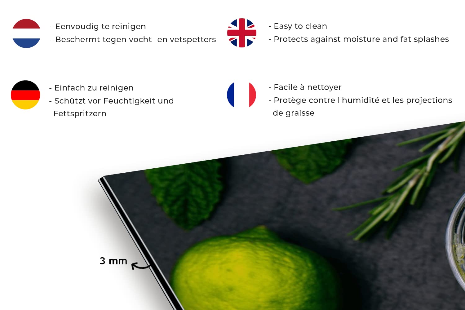 Revêtement résistant à la chaleur, Facile à nettoyer, Manuel inclus WENKO Fond de Hotte, Crédence Cuisine, Citrons, verre trempé, 56x50 cm, Multicolore - Bricolage Aspect luxueux : l'aluminium de 3 mm d'épaisseur a un aspect luxueux. Protection Mur éclaboussures Motif Credence Fruit - Aliment - Plante Fond De Hotte 60x30 Cm Credence Aluminium Plaque Inox De Cuisine Crédence Cuisine Design Citron Eau La couleur jaune de l'agrume se détache sur le fond noir. Grâce à cette protection contre les éclaboussures, le mur de votre cuisine ne sera plus jamais sale. MuchoWow Credence Citron - Fruit - Nature Morte - Eau - Jaune Fond de hotte 100x50 cm Credence Aluminium Plaque INOX de Cuisine : : Cuisine et MaisonÀ propos de cet article Facile à nettoyer : la surface de la crédence est lisse et facilite l'essuyage de la saleté! Aspect luxueux : l'aluminium de 3 mm d'épaisseur a un aspect luxueux. Entièrement équipée Impression extrêmement nette : impression photo unique pour votre cuisine. Le panneau arrière est simple à fixer. Caractéristiques du produit Tôle de protection en aluminium de 3 mm d'épaisseur Revêtement résistant à la chaleur Facile à nettoyer Manuel inclus Impression... La protection murale est en aluminium. En plus de protéger le mur arrière de votre cuisine, ce dosseret de cuisine est aussi le moyen idéal d'égayer votre cuisine. Facile à nettoyer : la surface de la crédence est lisse et facilite l'essuyage de la saleté! Trois citrons jaune vif plongent dans l'eau. Entièrement équipée : le panneau arrière est étanche et simple à monter.