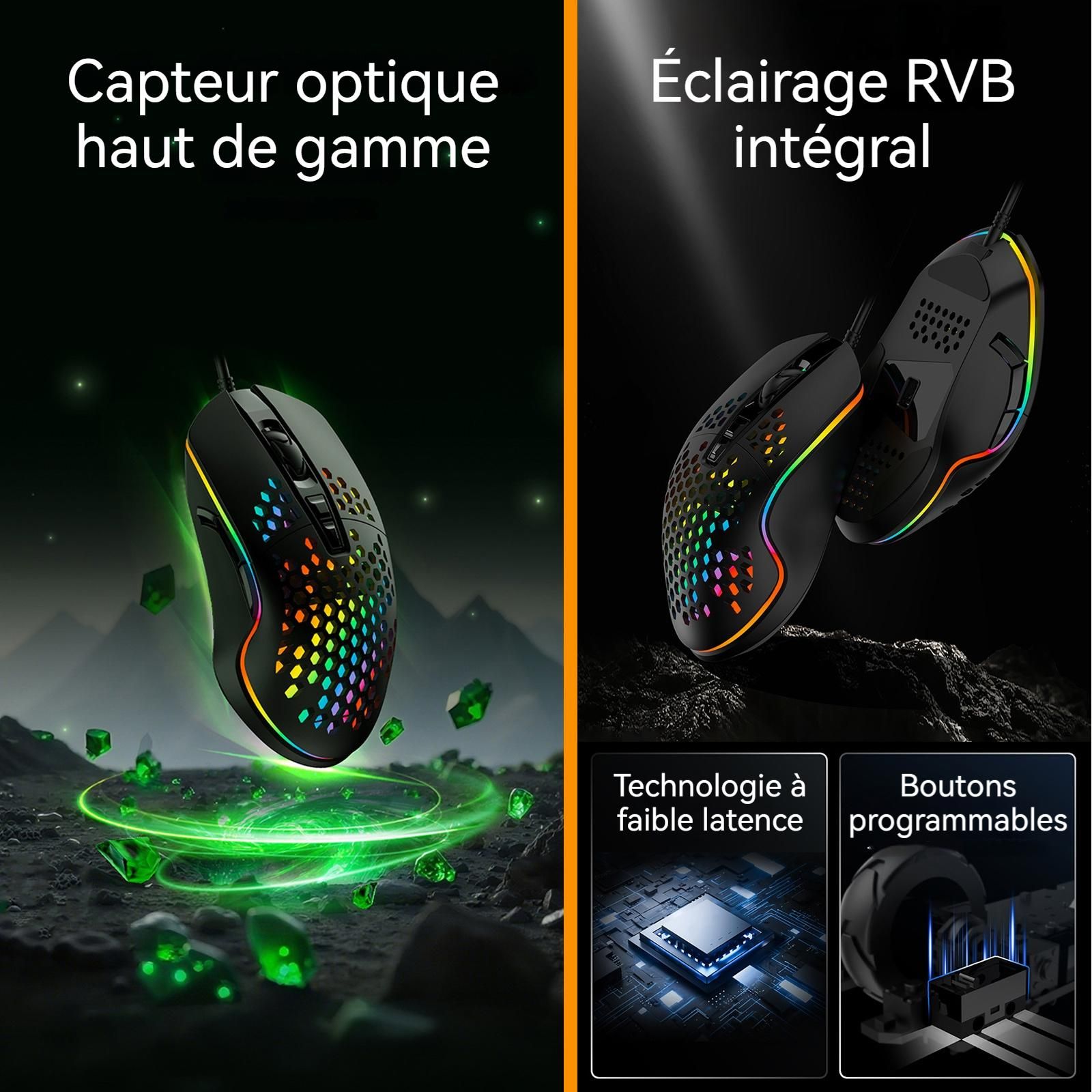 Souris de jeu sans fil, design ergonomique, clic silencieux, RVB lumineux, 2400 DPI 6 DPI réglabls t taux d rafraîchissmnt d 7 000 : prsonnalisz la snsibilité avc 6 nivaux DPI réglabls pour répondr à vos bsoins. Avc un taux d rafraîchissmnt d 7 000 FPS, chaqu mouvmnt st capturé avc précision, offrant un xpérinc d ju fluid Souris Ergonomic ARAMOX Souris Sans Fil Souris De Jeu Creuse Sans Fil Rechargeable RVB Fournitures Informatiques Souris Gaming 3600 Dpi Spec: Le capteur à haute précision réduit la fatigue musculaire et augmente votre flux de travail. De plus, travaillez sans effort sur les ordinateurs portables, les ordinateurs de bureau, et plus encore avec sa large compatibilité. Souris Sans Fil Rvb, Souris Sans Fil Abs 2.4G 2400 Dpi Rvb Pour Le Travail (Bleu)[H5289... Une excellente souris informatique offre un confort total avec un angle de poignée de main ergonomique, des poignées profilées. Type d'article: Recharge de souris sans fil à trois modes Capteur: FR2012 + 3212 Fréquence de retour par défaut: Mode BT: 125Hz, mode 2., 4G: 250Hz, mode câblé: 1000hz 4800 Frames par seconde Accélération: 10g Mode de fonctionnement: optique Type: câblé / 2,4 GHz / Bt5., 3 Longueur du câble: 1,8 m Nombre de boutons: 6 Buttes Lifspan: 10 millions de fois (clés silencieuse) Publite: 650ms RGB Distance sans fil: 10 têtes Rechargeable et personnalisable: est livré avec une batterie de 650 mAh, offrant une plage sans fil de 10 m et des paramètres personnalisables comprennent 6 boutons programmables et 6 modes de lumière RGB. Modes de capteurs multiples: équipés de capteurs FR2012 + 3212, prend en charge différentes fréquences dans les modes BT (125 Hz), 2,4 g (250 Hz) et les modes filaires (1000Hz) pour une grande précision et des performances.