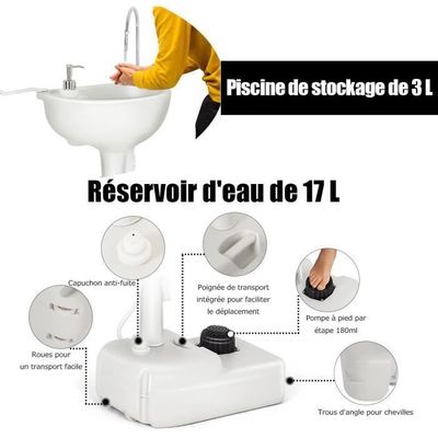 Le porte-serviettes facilite l'accès aux serviettes et leur séchage, et la crépine intégrée dans l'évier permet de séparer les résidus alimentaires et d'éviter l'obstruction des tuyaux. Evier De Camping Avec Pompe GYMAX Évier Portable, Station De Lavage Des Mains Pour évier Pompe à Pied Lavabo spacieux qui empêche les éclaboussures et offre beaucoup d'espace pour se laver les mains. EN STOCK : Évier portable camping pas cher. Grand choix, promos permanentes et livraison rapide partout en France. Paiement sécurisé # 𝐂𝐨𝐧𝐜𝐞𝐩𝐭𝐢𝐨𝐧 𝐝𝐞 𝐒𝐢𝐦𝐮𝐥𝐚𝐭𝐢𝐨𝐧 # Le grand bassin est conçu pour minimiser les éclaboussures et offrir beaucoup d'espace pour laver une grande variété d'objets et plus encore. # 𝐌𝐚𝐭é𝐫𝐢𝐚𝐮𝐱 𝐃𝐮𝐫𝐚𝐛𝐥𝐞𝐬 & 𝐂𝐨𝐧𝐬𝐭𝐫𝐮𝐜𝐭𝐢𝐨𝐧 𝐑𝐨𝐛𝐮𝐬𝐭𝐞 # Cet évier portable est fabriqué en HDPE résistant aux intempéries, qui peut être utilisé à l'extérieur pendant longtemps pour vous offrir une meilleure expérience. Grand réservoir d'eau de 17L pour une utilisation prolongée sans remplissage fréquent. Lavabo spacieux qui empêche les éclaboussures et offre beaucoup d'espace pour se laver les mains. Notre station de lavage des mains portable est pratique et... La pompe à pied fournit efficacement 180 ml d'eau par pression, et le long tuyau d'évacuation pour une circulation facile de l'eau le rend idéal pour les tâches de nettoyage répétitives. Robinets pivotants pour un accès facile à l'eau sous différents angles. À l'aide de piquets, l'évier peut être fixé dans les trous prévus à cet effet afin de garantir sa stabilité pendant l'utilisation. Évier de Camping à Roulette COSTWAY-Réservoir d'Eau 17L-Distributeur de Savon Liquide 3L-Pompe à # 𝐑é𝐬𝐞𝐫𝐯𝐨𝐢𝐫 𝐝'𝐄𝐚𝐮 𝐝𝐞 𝐆𝐫𝐚𝐧𝐝𝐞 𝐂𝐚𝐩𝐚𝐜𝐢𝐭é # Équipé d'un réservoir d'eau de 17 L, ce lavabo sur piedportable peut être utilisé plusieurs fois sans avoir à être rempli fréquemment. # 𝐃é𝐭𝐚𝐢𝐥𝐥𝐞𝐬 𝐁𝐢𝐞𝐧 𝐏𝐞𝐧𝐬é𝐞𝐬 # L'arrivée d'eau est équipée d'un bouchon qui facilite le remplissage et empêche les fuites.