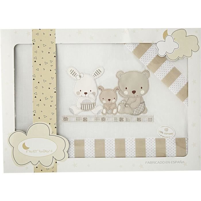 100% Coton Interbaby Parure De Lit Bébé Pour Voiture/couffin Couffin Bebe Complète avec drap housse ajustable, drap plat et taie d'oreiller, elle assure un couchage agréable et sécurisé. Le coton respirant convient parfaitement pour le printemps et l'été Parure Lit Bébé INTERBABY 3 Pièces 100% Coton | Voiture Fabriqué en 100 % coton, parfait pour les mois de printemps et d'été car il est très respirant. Parure de draps INTERBABY pour berceau 50 x 80 cm. Comprend 3 pièces, drap-housse, drap de dessus et taie d'oreiller. Présenté dans un écrin, idéal comme cadeau... Dimensions drap housse : 50 x 80 cm, drap plat : 110 x 82 cm, taie d'oreiller : 50 x 30 cm., Fabriqué en Espagne. Ce sont des draps frais qui respirent mieux pendant les mois de printemps et d'été, ce qui rend bébé à l'aise et détendu dans sa poussette. Parure de lit pour poussette composée de 3 pièces drap-housse, drap plat et taie d'oreiller. Parure de lit pour poussette 100 % coton pour que le repos de votre bébé soit plus confortable.