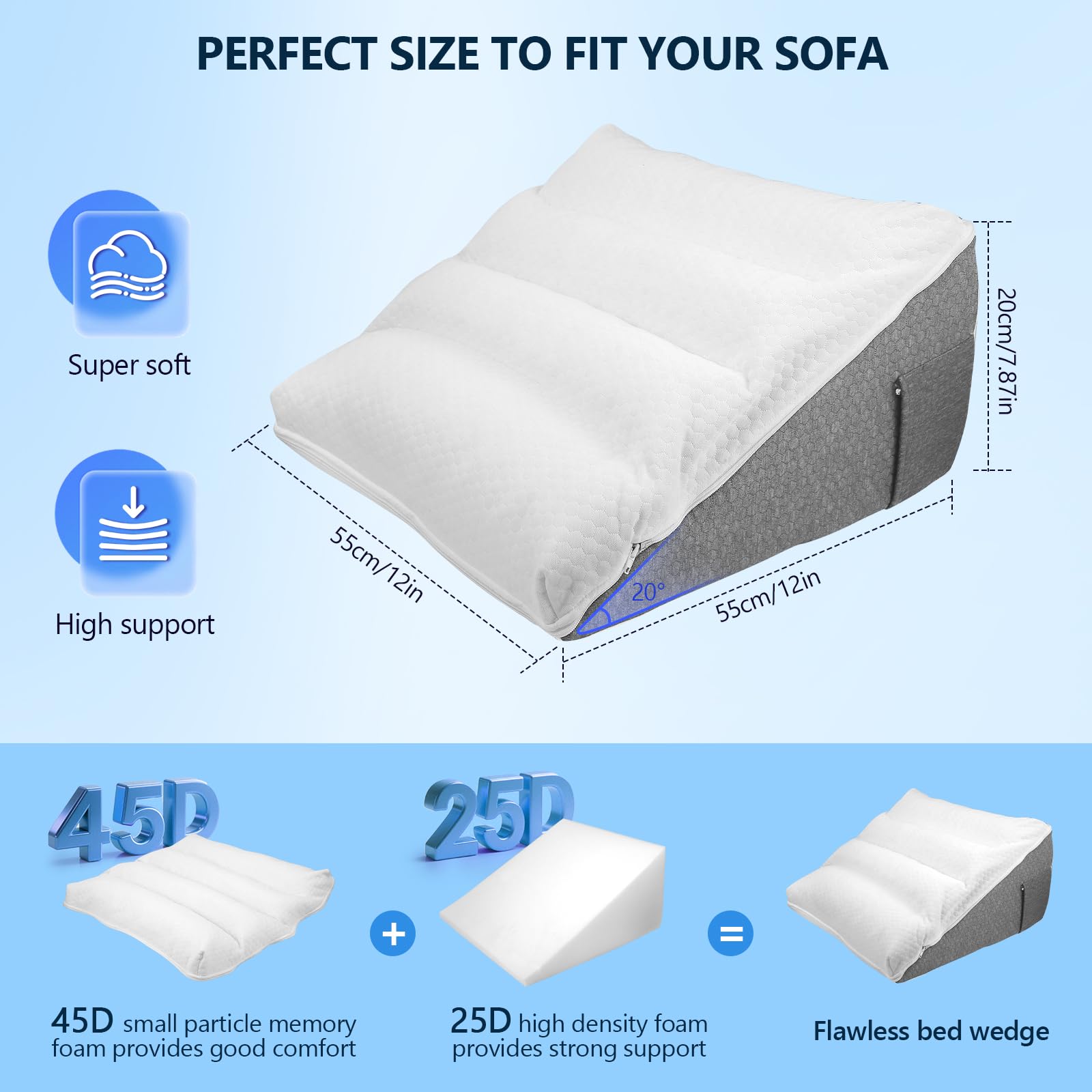 Le design unique en forme de coin s'adapte parfaitement aux différentes positions de sommeil (dos ou côté) et convient à toutes les habitudes de sommeil. Coussin Dossier Lit Triangulaire Coussin Triangular Anti-Reflux 65x60x20 Cm - Mousse Mémoire Pour Lit Et Canapé Oreiller Anti-reflux Oreiller De Lecture AviiatoR® Coussin De Lit Pliable 7 En 1 En Ousse à éoire De Fore - Soutien Orthopédique Soulagement Dos Reflux ❄️ 【Double couche miraculeuse】 ▸ Dessus : Mousse à mémoire de forme rafraîchissante ▸ Dessous : Mousse haute densité 25D (anti-affaissement) ✅ Réduit la tension à la taille de 72 %* 💆 【12 fois plus de bienfaits pour la santé】 | Ronflements 🛌 | Brûlures d'estomac 🔥 | | Douleurs chirurgicales 🏥 | Migraines 🌡️ | | Gonflement des jambes 🦵 | Mal de dos 💺 | ✨ 【Design et confort】 🔸 Surface 3D : élégant matelassage en losanges 🔸 Respirant : panneaux latéraux en maille 360° 🧼 【Entretien pratique】 ① Housse amovible (fermeture éclair) ② Lavable en machine (30 °C) ③ Séchage rapide : 📏 【Taille idéale】 55 × 55 × 25 cm (angle de 30 °) Convient pour : Lit 🛏️ | Canapé 💺 | Siège auto 🚗 Poids : 1,5 kg 📦 【Contenu de la livraison】 1 coussin incliné × 1 2 housses en coton × 1 3 instructions d'entretien ⚠️ 【Remarque】 ➊ Légère odeur de tissu pendant les 48 premières heures (normal) ➋ Pour un effet optimal, utiliser plus de 2 heures par jour Efficace contre les ronflements, douleurs post-opératoires, reflux gastrique (RGO), migraines, nez bouché, gonflement des jambes et maux de dos. AviiatoR® Coussin de lit pliable 7 en 1 en ousse à éoire de fore - Soutien orthopédique... 【Design Innovant à Double Couche】 Le coussin ergonomique pour lit et canapé possède une face supérieure en mousse mémoire rafraîchissante pour un confort optimal, et une base en mousse dense 25D offrant un soutien lombaire puissant. Le tissu respirant offre une grande aération et confort, combiné à l'effet rafraîchissant du noyau, pour une expérience de sommeil agréable. La housse se retire facilement pour un lavage en machine, simplifiant l'entretien. 【Housse Respirante et Amovible】 La housse extérieure tricotée en tissu respirant et la housse intérieure matelassée protègent le noyau tout en garantissant aération et fraîcheur.