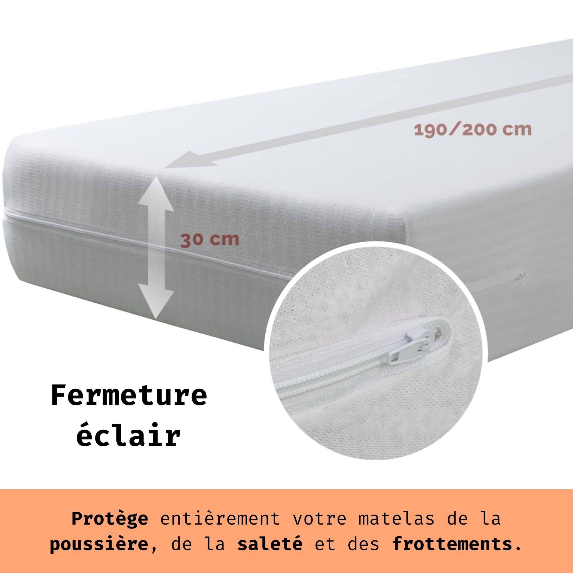 La marque Savel cherche à offrir à ses clients la meilleure qualité pour la protection de leur matelas Le tissu élastique et la fermeture à glissière permettent en effet à ce produit de s’adapter à des matelas mesurant jusqu'à 30cm de haut et d’en protéger toute la surface Le tissu respirant de la housse favorise le flux d'air et évite l'apparition de moisissure dans le matelas. Disponible en plusieurs tailles pour protéger tous les types de matelas La Housse de Matelas en Éponge Élastique de Savel qui la rend parfaitement adaptable aux matelas jusqu'à 200 cm de long et jusqu'à 30 cm de haut. Housse Lavable Machine Oeko Tex Pikolin Home - Housse De Matelas Imperméable Hypoallergénique 120 X 190/200 Cm - Protège-matelas Anti-acariens, Respirante, Lavable, Avec Fermeture Éclair Et De Sécurité Protecteur Matelas Fermeture Eclair Le lavage régulier de la housse évite la croissance et la prolifération de bactéries et d'acariens, et prolonge la durée de vie utile du matelas Élastique Cette housse de matelas élastique et respirante s'adapte à toutes les tailles de matelas. Les housses de matelas Savel protègent le lit de la poussière, des frottements et de la transpiration, et améliorent l'hygiène pendant le repos. Ajustement parfait pour des matelas avec une hauteur entre 20 et 30 cm, et une longueur entre 180 cm et 200 cm. Profitez du confort de votre lit sans aucune préoccupation. La fermeture éclair protège hermétiquement le matelas de la saleté, de la poussière et des frottements contre la base du lit. Fabriqué en Europe selon les normes de qualité les plus élevées. Découvrez nos offres Housse de matelas anti-punaise de lit 140x190 : large sélection de produits au meilleur prix | Livraison gratuite à partir de 10€* | Entreprise française | Paiement 4x possible Fermeture éclair Sa fermeture éclair en forme de U, elle favorise l'adaptabilité et la facilité de mise en place et protège le matelas dans son intégralité. Ce protecteur de matelas avec fermeture éclair peut être lavé en machine jusqu'à 40ºC et séché dans le sèche-linge à basse température. Savel - Housse de Matelas avec Traitement Contre Les acariens