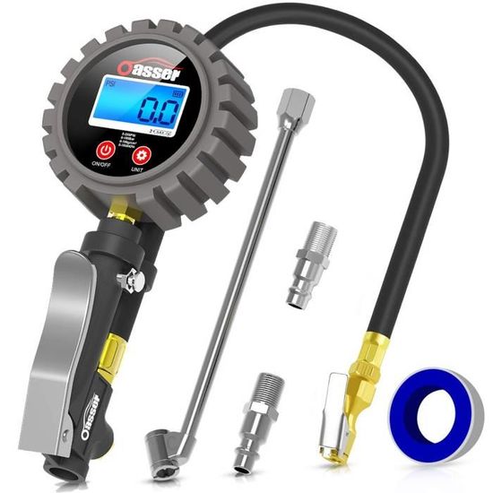 【Informations sur le produit】 --Couleur : Noir --Plage de mesure : 0–16 BAR / 0–220 PSI / 0–1500 KPa --Tuyau : Tuyau en caoutchouc renforcé et flexible, avec raccord en laiton --Unités de mesure disponibles : BAR, PSI, KPa, kg/cm² 【Conseils d’utilisation】 --Veuillez manipuler ce produit avec précaution. Ce manomètre est idéal pour surveiller avec précision la pression des pneus de voiture, moto, vélo ou camping-car, garantissant sécurité et performance lors de chaque trajet Ce manomètre pression pneu numérique est conçu pour résister à une utilisation intensive sur route ou en tout-terrain --Large éventail d’applications – Ce gonfleur de pneus portable est conçu pour de nombreux usages : pneus de voitures, camions, vélos, mais aussi ballons, hoverboards, etc. Adiwo Numérique Manomètre Pression Pneu 220 PSI Haute Précis --Lors de la mesure ou du gonflage, assurez-vous que le raccord est bien scellé pour éviter les fuites d’air. --Rapide et facile à utiliser – Utilisation à une main avec système à clip, bien plus rapide qu’un pistolet de gonflage traditionnel. Manomètre Pression Pneu Numérique Pneus 0-60 Psi Jauge 4pcs Bouchons... Ce gonfleur pneu est parfait pour éviter la sous-pression ou la surpression, et prolonger la durée de vie de vos pneus --Structure robuste – Matériaux de haute qualité assurant une longue durée de vie de votre gonfleur pneu. Le manomètre pression pneus dispose également d’une soupape de purge intégrée pour ajuster précisément la pression souhaitée sans effort Pistolet De Gonflage GLOSKIN Manometre Pression Pneu, 220PSI Poignée Gonflage Avec Outil De Noyau De Valve, Gonfleur Pneu,Accessoires De Compresseur, Pour Voiture, Moto, Camion, Vélo Compresseur à Air Portatif Manomètre Pour Pression De Pneu Manomètre Pression Numérique Haute... ✅【Convient à la plupart des types de pneus】Ce pistolet de gonflage est livré avec divers adaptateurs, un embout pour ballons et un raccord pour compresseur, le rendant compatible avec les pneus de voiture, SUV, moto, vélo, camping-car, ainsi que pour les ballons gonflables.