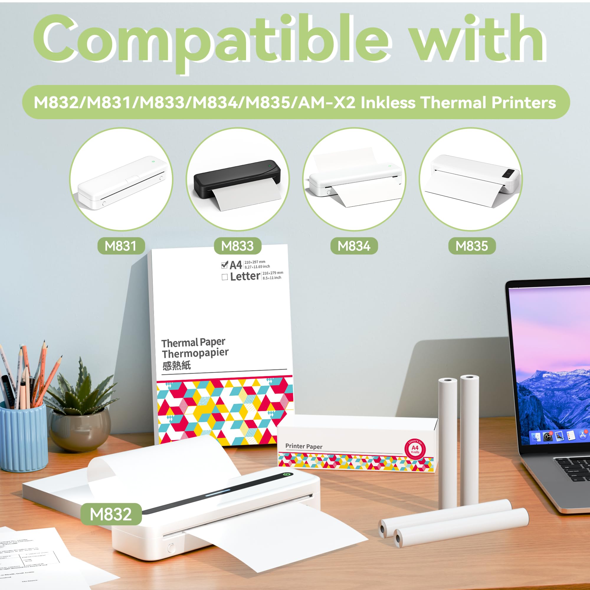 Phoeo Ipriante Therique A4, Ipriante Portable sans Encre pour... Compatible : ce papier thermique de 21,6 x 27,9 cm est compatible avec les imprimantes Colorwing, Odaro, Itari, Phomemo, M08F Letter, M832, M834, MT800, MT800Q, Jadens, Brother Letter. Ne prend pas en charge les imprimantes laser, les imprimantes à jet d'encre ou les photocopieurs Papier Pour Phomemo M832 4 Rouleaux De Papier Thermique A4 Phomemo - Sans BPA Pour Imprimante Portable Fourniture Bureau Thermique ASprink Rouleau de Papier Thermique 53MM, Compatible avec Toutes Les Marques d'Imprimantes Portables M832, Papier Thermique en Rouleau avec 3 Rouleaux