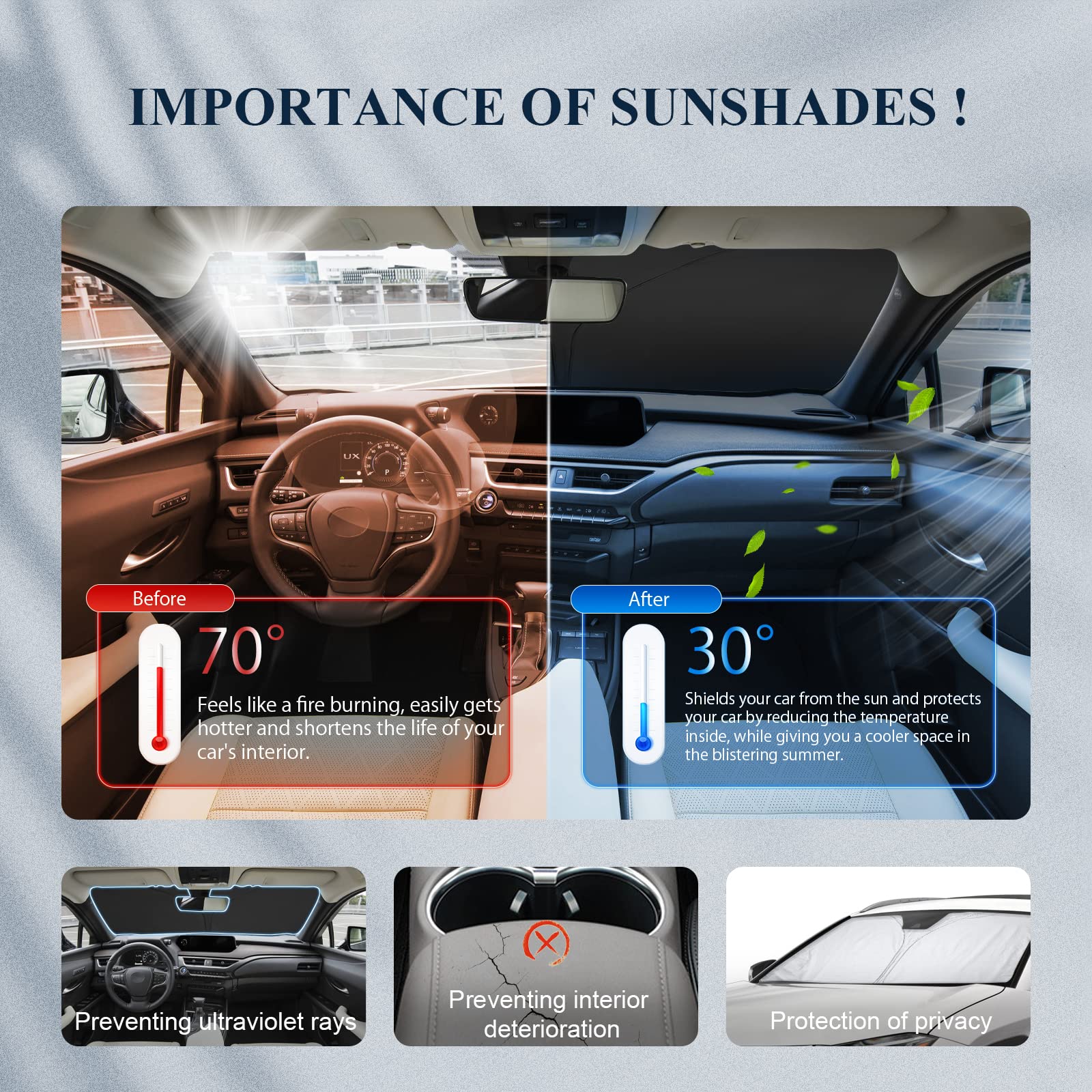 BIBIBO Pare-Soleil pour Pare-Brise Avant Compatible avec Lexus UX 2019-2025, Protection Solaire Pliable Anti-UV. 4,1 sur 5 étoiles 14. 2 offres à partir de 27... Ce pare-soleil s’installe et se retire en quelques secondes, sans laisser de résidus sur le pare-brise Pliable et peu encombrante : Se plie rapidement grâce aux bandes élastiques intégrées. Pare-soleil Sur Mesure Lexus NINAI Pare-Soleil De Pare-Brise Voiture Avant Pour Lexus UX 250H Protection Anti-UV Voiture Protection anti-UV renforcée : Équipé d’un revêtement argenté réfléchissant, il protège efficacement le tableau de bord, les sièges et les accessoires intérieurs contre les rayons UV nocifs et la décoloration due à l’exposition prolongée au soleil Avec ou sans pare-soleil, la différence est flagrante : sans protection, les plastiques fondent, les cuirs se fissurent, la console surchauffe. Avec ce modèle, tout reste intact et tempéré. Il protège non seulement contre la chaleur, mais aussi contre la décoloration due aux UV, tout en préservant votre intimité Excellente protection solaire : Grâce à sa surface réfléchissante professionnelle, ce pare-soleil bloque efficacement les rayons du soleil, réduit la température à l’intérieur du véhicule et crée un environnement de conduite plus frais et confortable Pare-soleil de fenêtre avant pliable pour voiture - Installation facile