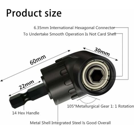 Plage de serrage du mandrin : 0,8-10 mm. HSEAMALL Perceuse manuelle à manivelle de 1,5 à 10 mm de capacité, double pignons, perceuse... Compatibilité universelle : avec une tige hexagonale de 8 mm, cet accessoire de perceuse est compatible avec la plupart des perceuses sans fil sur le marché, s'adapte sans effort à diverses perceuses électriques, perceuses manuelles, équipements de polissage et autres outils. ❤ Le design de pliage à 90 degrés offre une excellente maniabilité, ce qui le rend idéal pour des tâches telles que l'installation d'armoires, d'étagères ou de travaux sur des projets automobiles. Outil Bricolage Compact Embout De Perceuse à Angle Droit De 0,8 à 10 Mm Avec Tige Ronde à 90 Embout Perceuse Angle Droit Design compact : cet accessoire de perceuse à angle droit dispose d'un design compact et ergonomique, permettant d'accéder aux espaces restreints et aux coins difficiles à atteindre avec une perceuse standard. Professionnel et pratique : ❤ Cet accessoire de perceuse à angle droit est un outil polyvalent qui vous permet d'accéder facilement aux coins étroits et aux espaces confinés. Le couple maximal supporté est de 25 N-m. Offre une polyvalence pour diverses tâches de perçage. Cette polyvalence convient aux accessoires d'outils de différentes tailles, améliorant l'efficacité et la flexibilité du travail. Compatibilité : convient à la plupart des perceuses standard avec tige hexagonale de 8 mm, telles que les perceuses manuelles/électriques, les perceuses électriques, les accessoires de polissage, etc. Caractéristiques : Matériau : acier au carbone. Adaptateur de fixation de vis à angle de 105° : la perceuse d'angle convient aux espaces restreints et peut être fixée à une perceuse, une perceuse sans fil ou un tournevis à main Le couple le plus élevé de 1500 tr/min et 25 N·m. Perçage efficace : le coude à 90 degrés permet un perçage efficace à angle droit, ce qui le rend idéal pour des tâches telles que l'installation de charnières, le perçage de trous de cheville ou le travail dans des espaces confinés. Embout d'angle de tournevis Perceuse à Angle Droit de 105° Accessoire pour Perceuse