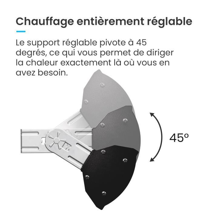 KESSER® Chauffage radiant avec télécommandé pour l'intérieur et l Chauffage infrarouge terrasse BRC 3000 W noir Radiateur Extérieur 3000W Télécommande IP65 Support Mural VEVOR Chauffage Exterieur Terrasse, 2000 W, Radiateur Infrarouge De Plafond Suspendu Electrique Avec Telecommande Protection Ip34 Chaine Reglable Chauffage Pour Porche Interieur Salle A Manger 84777298 Chauffage Extérieur Infrarouge SpécificationsNuméro du modèle de l'article : T17-GR30BPuissance : 3000 W (+5%, -10%)Alimentation : CA 220-240 V 50 HzVitesse : 9 vitessesIndice de protection : IP65Type de tube chauffant : brasage au carbonePoids net (y compris tous les accessoires) : 5,51 lb / 2,5 kgDimensions (L x l x H) : 40,16 x 3,94 x 2,36 pouces / 1020 x 100 x 60 mmContenu du Colis1 x chauffage infrarouge1 x télécommande (sans pile, utilise des piles AA)4 x vis à tête plate4 x écrous à oreilles6 x vis autotaraudeuses6 x boulons d'expansion2 x plaques de montage Protection IP65 : construit avec un boîtier en alliage d'aluminium, il est résistant à la rouille et à la corrosion. VEVOR Chauffage extérieur terrasse, 3000 W, radiateur infrarouge... Chauffage rapide 3 s : équipé de tubes chauffants infrarouges en fibre de carbone de qualité supérieure, il offre une conduction thermique rapide et une puissance thermique élevée sans préchauffage, assurant un chauffage uniforme en seulement 3 secondes. Affichage LED : pour plus de commodité, le radiateur dispose d'un écran LED HD avec des réglages de température clairs et une fonction de minuterie de 24 heures. Télécommande : livré avec une télécommande pour un fonctionnement pratique, vous permettant de contrôler le chauffage de n'importe où. Cette conception conviviale élimine le besoin d’une opération marche/arrêt manuelle.