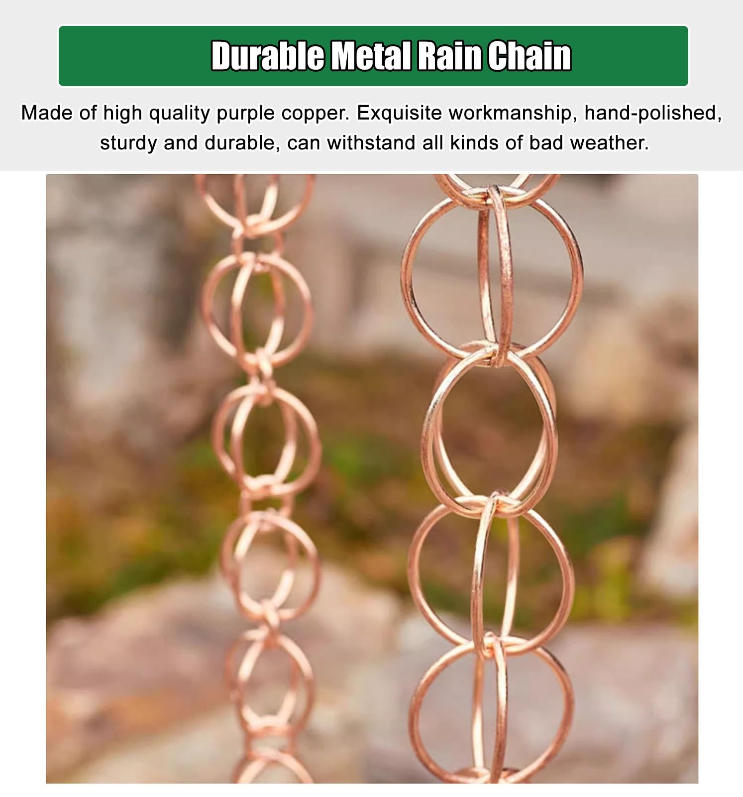 Caractéristiques : *Nom de la pièce : chaînes de pluie., *Matériau : métal., * Taille : environ 1 m., Couleur : voir photo. Rénovation des descentes d'eau pluviale avec des tubes d'évacuation Installation facile : la chaîne de pluie en métal est livrée avec un crochet de suspension, ce qui rend l'installation un jeu d'enfant. Chaîne Pluie Avec Carillon Chaine De Pluie Anneau Décoratif Chaînes De Pluie En Cuivre, Tuyau De Descente De Remplacement De 6,5 Pi/7,8 Pi/8,5 Pi Pour Les Gouttières, Cloche à Chaîne De Pluie Cuivre Décoration Jardin *Large utilisation : la chaîne de pluie décorative avec un carillon à vent est idéale pour les toits, auvents, abris de jardin, pavillons, abris de jardin, etc. Il sert à la fois fonctionnel et décoratif, ajoutant une touche unique à n'importe quel espace extérieur. Description de Chaîne de pluie en cuivre plaqué, 1,2 m, pour gouttières avec adaptateur, coupelles Lotus pour remplacer le tuyau de descente de gouttière Ravissante chaîne de pluie : Envie d'améliorer votre décoration intérieure ? Cette élégante chaîne de pluie est une alternative élégante aux descentes pluviales disgracieuses. Suspendez-la à la gouttière et la pluie s'écoulera... Aucun outil supplémentaire n'est nécessaire. 【Becs de pluie fonctionnels】Ces chaînes de pluie sont conçues pour être fonctionnelles, adaptées pour les maisons à un étage. TUYAU DE DESCENTE CUIVRE 100 2 ML - LMC Virano Il complète tout type de décoration extérieure et résiste à diverses conditions météorologiques. Matériau : fabriquée en fer avec une finition en cuivre brillant, cette chaîne de pluie est non seulement visuellement attrayante, mais également résistante à l'usure. Ils servent de remplacement élégant pour les tuyaux de descente traditionnels, redirigeant efficacement l'eau de pluie loin du toit et des fondations de votre maison. Accrochez le crochet sur le lavabo. Accrochez le crochet sur un bassin ou un réceptacle et regardez l'eau de pluie tomber gracieusement sur la chaîne.