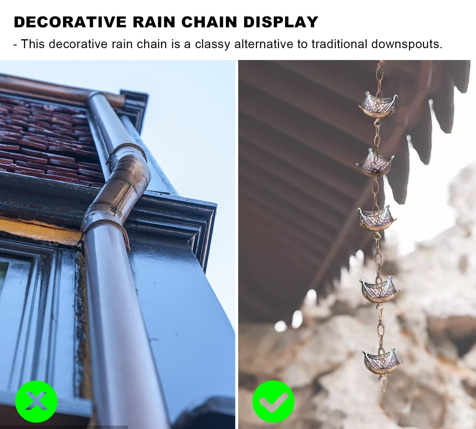 Pourquoi et comment récupérer l'eau de pluie Largement utilisé]: La chaîne de pluie de gouttières est idéale pour , les hangars, les gazebos, les jardins, les cours, les cours, les maisons, etc Chaîne Pluie Chaîne De Pluie Avec Bec De Vidange De Pluie, Chaîne Suspendue Pour Chaine De Pluie - 【Matériau de qualité supérieure】: La chaîne de pluie est fabriquée en fer de qualité supérieure, résistant aux intempéries, à l'usure et robuste, garantissant une longue durée d'utilisation - 【Chaîne de gouttière】: La chaîne de récupération d'eau de pluie peut être une excellente pièce de rechange pour les descentes pluviales traditionnelles et comme décoration de jardin extérieur pour créer un effet magnifique et charmant - 【Installation facile】: La chaîne de pluie suspendue est simple à installer et ne nécessite aucun outil, il suffit de l'accrocher sur l'avant-toit - 【Largement utilisé】: La chaîne de pluie pour gouttière est idéale pour , les hangars, les belvédères, les jardins, les cours, les cours, les maisons, etc. 【Largement utilisé】: La chaîne de pluie pour gouttière est idéale pour , les hangars, les belvédères, les jardins, les cours, les cours, les maisons, etc. Matériau] : Fabriquée en fer robuste, cette chaîne de pluie est conçue pour résister aux intempéries et garantit une utilisation sans se détériorer... environ 6,6 cm x 149,5 cm / 2,60 pouces x 58,86 pouces Spécification: - Matériau : Métal Fer Tableau de taille: - 6,6 cm x 149,5 cm/2,60 pouces x 58,86 pouces Le forfait Comprend: 1 tasse de chaîne de pluie Note: Veuillez prévoir une légère marge d'erreur de 1 à 2 cm/0,39 à 0,79 pouce en raison de la mesure manuelle. environ 6,6 cm x 149,5 cm / 2,60 pouces x 58,86 pouces 【Installation facile】: La chaîne de pluie suspendue est simple à installer et ne nécessite aucun outil, il suffit de l'accrocher sur l'avant-toit 【Matériau de qualité supérieure】: La chaîne de pluie est fabriquée en fer de qualité supérieure, résistant aux intempéries, à l'usure et robuste, garantissant une longue durée d'utilisation