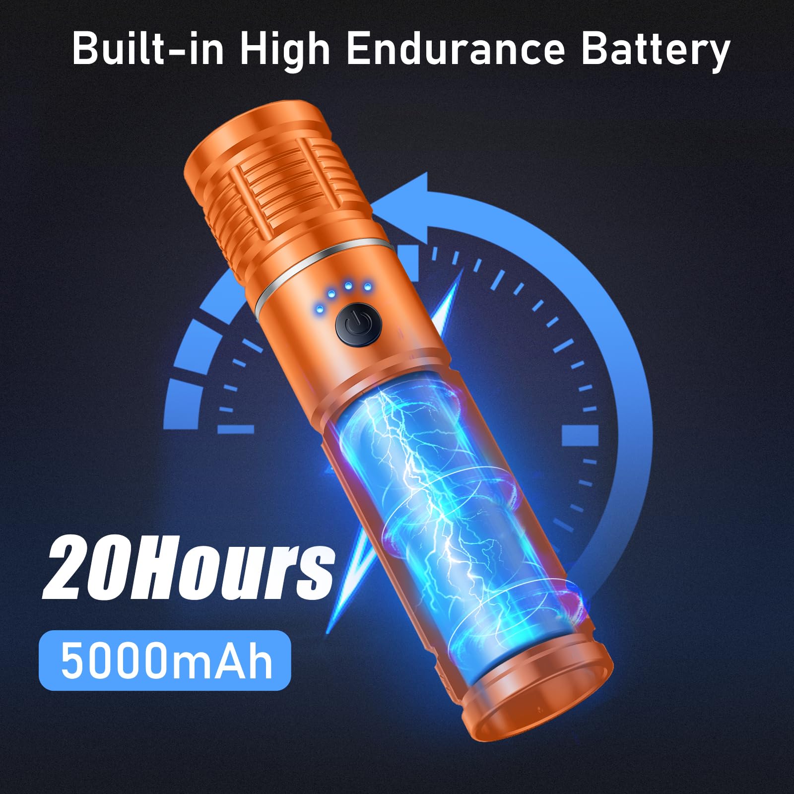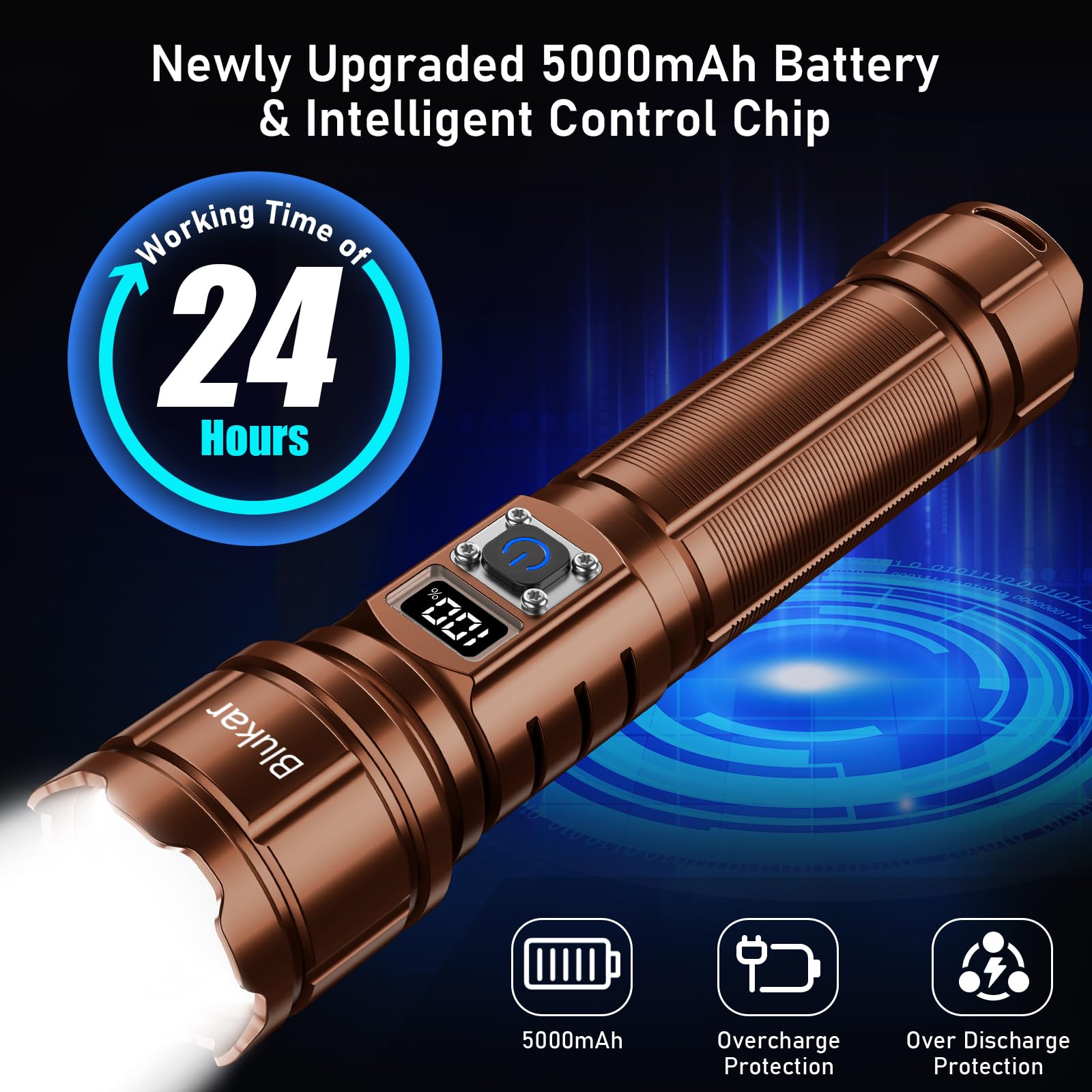 Appuyez brièvement sur le bouton l'interrupteur pour changer de mode d'éclairage, et sur le bouton de température de couleur pour passer de la lumière chaude à la lumière blanche. Lampe Torche Led Ultra Puissante Blukar , Lampe De Poche Rechargeable Avec Batterie 5000mAh Lampe Led Fonction Mémoire et Mise au Point Rglable: Appuyez longuement sur l'interrupteur pendant 3s ou appuyez à nouveau après 8s d'inactivité pour éteindre la lampe torche. Lampe De Poche Led Rechargeable Blukar Lampe Torche LED Rechargeable, , IPX6 Étanche, 5 Modes D'éclairage & Zoomable, Longue Durée Pour Camping/ Randonnée/Urgence/Bricolage Lampe De Poche Led Ultra Puissante 10 Modes & Commande à 2 Boutons: 5 Modes de lumière chaude+5 modes de lumière blanche(même mode)-forte/moyenne/faible/trobo/SOS. (Conseils: le réglage de la température de couleur ne peut être effectué que lorsque la lampe est allumée., ) Super Lumineux & 2 Températures de Couleur Blanc/Chaud: Blukar lampe torche LED est dotée d'une puce LED haut de gamme. Son faisceau lumineux et uniforme permet d'éclairer facilement une pièce entière ou une longue distance dans l'obscurité. [Lampe Torche LED Ultra Puissante]Blukar lampe de poche pu... Étanchéité IPX6, ne craint ni la pluie ni la neige. La lampe torche se recharge complètement en seulement 2H à 3 H et offre jusqu'à 17 H d'autonomie en mode lumière faible. La conception zoomable vous permet d'ajuster la distance focale pour élargir ou réduire le faisceau selon vos besoins. USB C Rechargeable & L'indicateur de... Facile à recharger grâce au câble USB C fourni. USB C Rechargeable et Longue Durée: Batterie intégrée de grande capacité (1800 mAh) pour une utilisation longue durée. 4 Indicateurs de batterie affichent l'autonomie restante, vous évitant ainsi la gêne d'une panne de batterie soudaine. Super Lumineux & 2 Températures de Couleur Blanc/Chaud: Blukar lampe torche LED est dotée d'une puce LED haut de gamme. Fabrication fiable avec un corps en aluminium durable.