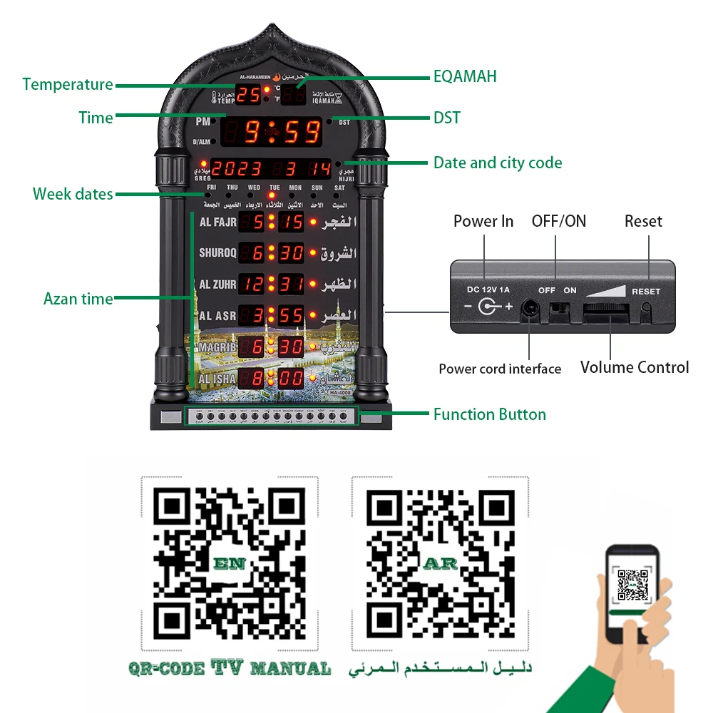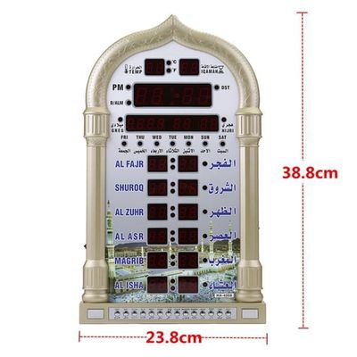 * Fonction de température : affiche la température en degrés Celsius et Fahrenheit, avec la possibilité de basculer entre les deux échelles. FLYING-Horloge de prière musulmane Alarme islamique avec réveil Azan Élégante décoration d'intérieur : avec des dimensions de 330 mm, cette belle horloge murale sert à la fois de rappel pratique de l'heure de prière et de décoration élégante pour votre maison, salle de prière ou mosquée. Horloge Azan Numérique Horloge Murale De Prière Islamique Musulmane Fonction De Rétroéclairage Adhan Appel A La Priere * Fonction snooze : vous permet de faire une pause pendant 5 minutes supplémentaires. Caractéristiques : * Nom de la pièce : horloge murale de prière musulmane * Matériau : plastique + miroir en verre. HORLOGE MURALE CALENDRIER Azan avec affichage de l'heure mondiale... Construction de qualité : fabriquée avec un cadre en plastique durable et une surface miroir en verre, cette horloge allie durabilité et design élégant. Affichage de la température : surveillez facilement votre environnement domestique avec un double affichage de la température en degrés Celsius et Fahrenheit qui peut être commuté avec facilité. Il vous suffit de parcourir notre vaste sélection des meilleurs horloge mural islamique de prière et de filtrer par meilleure correspondance ou par prix pour trouver celui qui vous convient le mieux L'écart de temps de prière peut être ajusté individuellement pour chaque prière ou désactivé selon vos préférences. Horloge de prière musulmane polyvalente : cette horloge murale Azan dispose d'une heure mondiale sélectionnable avec 1500 villes disponibles, vous permettant de suivre avec précision les heures de prière où que vous soyez. Restez à l'aise et informé de votre environnement en toutes saisons. * Fonction d'alarme : offre à la fois une alarme unique et des options d'alarme récurrentes, avec un son de tic-tac pour vous réveiller. Disponible dans des finitions sophistiquées dorées ou argentées.