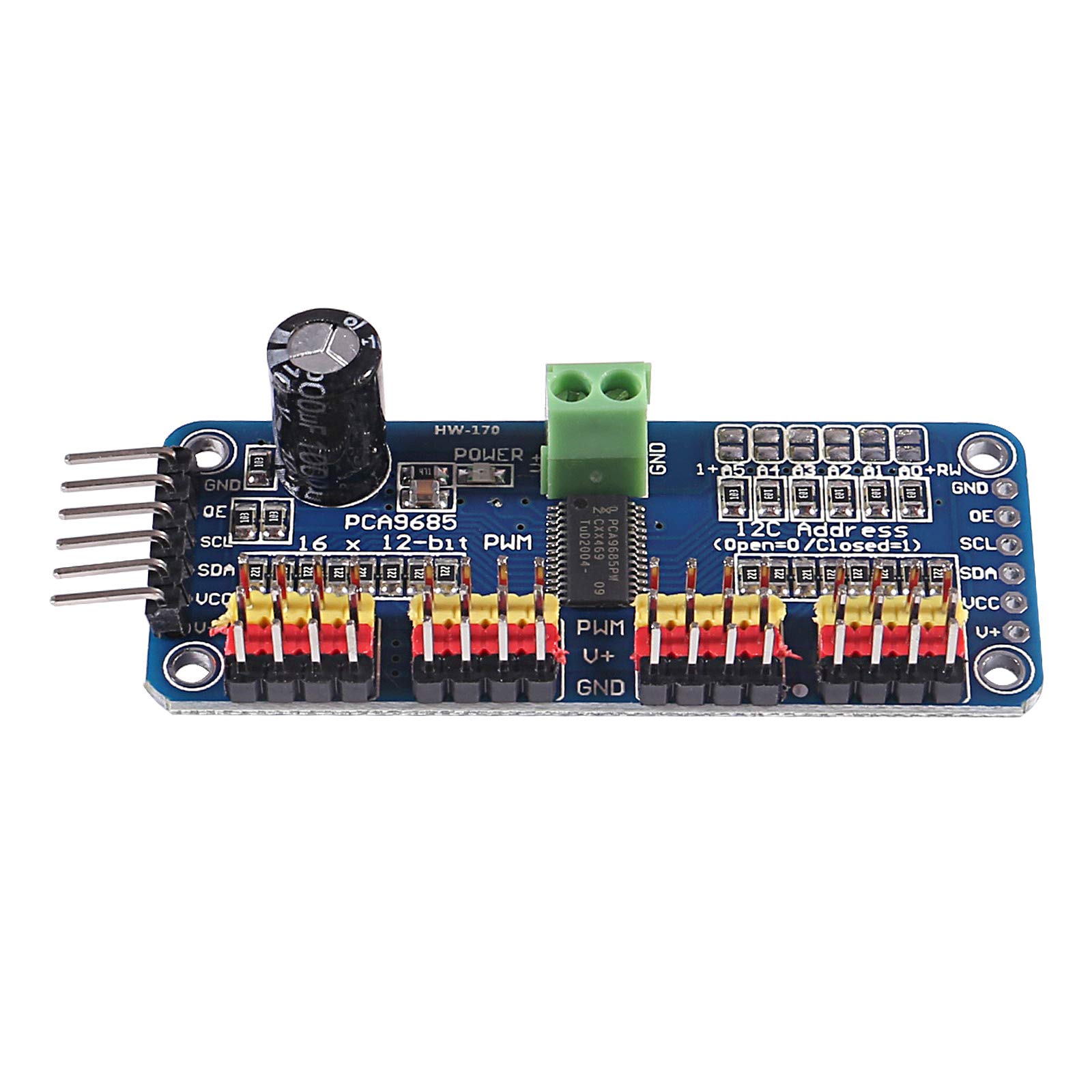 Módulo De 16 Canales De 12 Bits PWM/servo Driver-I2C Interfaz PCA9685... Si vous souhaitez piloter plus de 16 sorties, plusieurs modules peuvent être connectés en série. Liste des produits : le produit comprend un total de 2 modules Treiber, qui peuvent complètement répondre à vos besoins d'utilisation quotidienne et de remplacement. Raspberry Pi Pca9685 Módulo De Protección PCA9685PW, 16 Canales, 12 Bits, PWM/Servo Driver-I2C, PCA9685, Raspberry Pi Compatible Raspberry Pi Arduino Paramètres du produit : ce contrôleur PWM à 16 canaux est basé sur la puce PCA9685., Il est conçu pour fournir jusqu'à 16 canaux de contrôle PWM, qui peuvent être utilisés pour contrôler la luminosité des LED ou des servomoteurs. Amazon Paramètres du produit : ce contrôleur PWM à 16 canaux est basé sur la puce PCA9685. Il est conçu pour fournir jusqu'à 16 canaux de contrôle PWM, qui peuvent être utilisés pour contrôler la luminosité des LED ou des servomoteurs Item Specifications Fréquence:40 Hz-1000 Hz Nombre de canaux:16 Résolution:12 bits Tension de fonctionnement:3,3 V/5 V Puce:PCA9685 Sortie:PWM Couleurs principales:Jaune, bleu, rouge, vert, noir Matériau:Plastique, métal Package 2x Modules de treiber DiGiYes PCA9685 driver de servomotor PWM de 16 canales Módulo IIC de 12 bits para robot Arduino