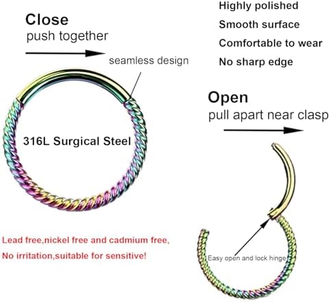 BESTEEL Lot de 6 anneaux de nez à charnière en acier MATÉRIAU : Nos bagues de nez sont fabriquées en acier inoxydable 316, sans nickel, sans plomb et hypoallergénique. Anneau Nez Piercing 365 SLEEPERS Piercing Septum Hexagonal En Titane De Qualité 18 G - Anneau Segmenté à Charnière - Anneaux De Piercing Pour Lèvre, Hélix, Cartilage, Rook - 8 Mm - 10 Mm, Titane, Pas De Gemme Percing Au Nez Vous pouvez essayer différents emplacements tels que les narines, le cartilage, les lèvres et plus encore. En acier inoxydable 316L (sans nickel ni plomb), hypoallergénique et safe pour les peaux sensibles. Diamètre intérieur : 6, 8, 10 et 12 mm - donc y en a pour... Découvrez notre vaste gamme de Anneaux de cartilage en acier chirurgical 16 g et 18 g avec motifs de chaînes 6 mm, 8 mm, 10 mm et 12 mm, triple anneau de nez à charnière épais, anneau segmenté, anneau de septum, daith, hélix, conque, tour, bijoux de piercing en or chez SHEIN, partie de notre Boucles d'oreilles pour femmes Retours... LARGE APPLICATION : Vous pouvez changer l'anneau de nez en différentes tailles et couleurs selon les occasions, la position du piercing aura un effet différent sur l'habillage ! FACILE À UTILISER : il suffit d'ouvrir et de fermer l'œillet manuellement pour le remplacer, sans utiliser d'autres outils, mais assurez-vous qu'il est fermement fermé lorsque vous le portez, ce qui garantit un confort maximal et un ajustement solide, et il ne tombera jamais tant que vous ne l'ouvrirez pas. Vous pouvez essayer différents emplacements tels que les narines, le cartilage, les lèvres, etc. Cadeau idéal pour les mariages, Noël, la Saint-Valentin, les anniversaires et les fêtes de fin d'année pour vos proches, vos meilleurs amis et bien plus encore. Cadeau parfait pour les mariages, Noël, la Saint-Valentin, les anniversaires et les anniversaires pour vos bien-aimés, vos meilleurs amis et plus encore. Vous recevrez 6 anneaux, 3 en argent et 3 en or, d'une épaisseur de 1,2 mm, dont 2 avec un diamètre intérieur de 6 mm, 2 avec un diamètre intérieur de 8 mm et 2 avec un diamètre intérieur de 10 mm.