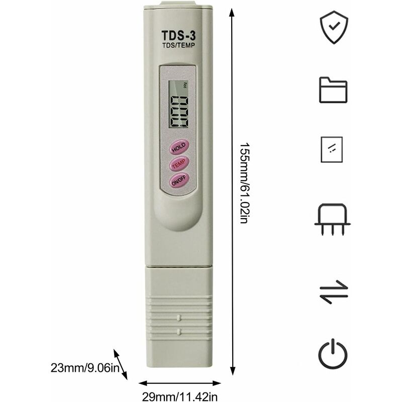 Fonction d'arrêt automatique : éteignez l'outil après 10 minutes d'inactivité pour conserver les piles. Testeur Eau Pureté Arrêt Automatique TDS Testeur De Qualité De L'eau, Mesure De Dureté De L'eau HH Appareil Contrôle Eau Aquarium Plage de mesure: 0-9990 ppm, avec une résolution de 1 ppm. VBESTLIFE testeur de compteur TDS 0-4999ppm Testeur de qualité de L'eau Potable, TDS Mètre de... Le testeur du testeur TDS peut être utilisé dans : purificateurs et filtres à eau, surveillance de la qualité des aliments (légumes, fruits) et boissons, piscines et spas, aquariums, cultures, etc. Fonction Hold : sauvegarde les mesures pour une lecture et un enregistrement faciles. LEX 0-1999ppm TDS Testeur de qualité eau Analyzer Meter Detector Monitor Water Quality Tester... Appuyez sur le bouton « TEMP » pour déplacer le testeur de température entre degrés Fahrenheit et degrés centigrades. Industries applicables : laboratoires d'eau, CDC, industrie de l'aquaculture, hôpitaux, piscines, tests de qualité des eaux de robinet domestiques. TDS signifie solides dissous de Tatal, au nom des impuretés dissoutes dans l'eau, plus la valeur de TDS, qui indique la teneur en impuretés dans l'eau, moins la teneur en impuretés sera faible. Testeur d'eau de piscine, compteur de température PH et TDS 3 en 1, stylo de test numérique de qualité de l'eau, haute précision (sans batterie) | Leroy Merlin Pour vous assurer de toujours boire de l'eau pure et sûre, le testeur TDS est recommandé pour chaque famille. Précision de mesure: 1; Batterie: pile bouton 1., 5V