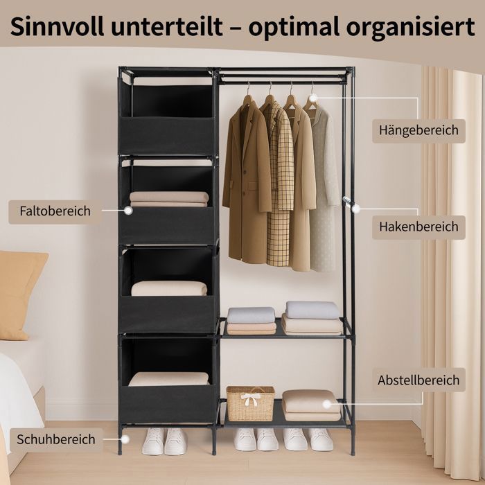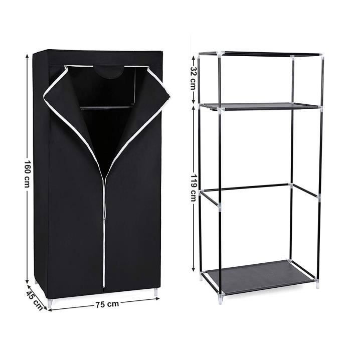 COSTWAY Armoire de Rangement Penderie en Tissu 1 Etagère Portable 75x50x170cm Noir... 【Polyvalence d'utilisation】Fabriquée en matériau respirant et écologique, cette armoire légère s'intègre parfaitement dans chambre, salon, dressing ou espace de stockage temporaire, résolvant tous vos défis d'organisation 【Montage express et sans outils】Aucun outil requis : un simple emboîtement des tubes métalliques et connecteurs permet un assemblage en quelques minutes, prêt à l'emploi et facilement transportable lors des déménagements Armoire Dressing Provisoire TactFire Armoire De Rangement En Tissu, Penderie Avec Housse Rangement Armoire Vetement 【Grande capacité de rangement】Avec ses dimensions spacieuses 105 x 45 x 170 cm, cette armoire organise facilement vêtements et affaires, idéale pour petits espaces, locations ou dressings, optimisant instantanément votre espace Grande capacité de rangement]Avec ses dimensions spacieuses 105 x 45 x 170 cm, cette armoire organise facilement vêtements et affaires, idéale pour petits espaces, locations ou dressings, optimisant instantanément votre espace 【Structure solide et durable】Cette armoire de rangement allie un cadre en acier haute résistance à un tissu non-tissé renforcé, avec des connecteurs en PP, garantissant une structure stable et une excellente capacité de charge pour un stockage à long terme Willonin® Armoire Penderie portable de chambre en Toile non tissée Noir, Garde-Robe avec Etagère