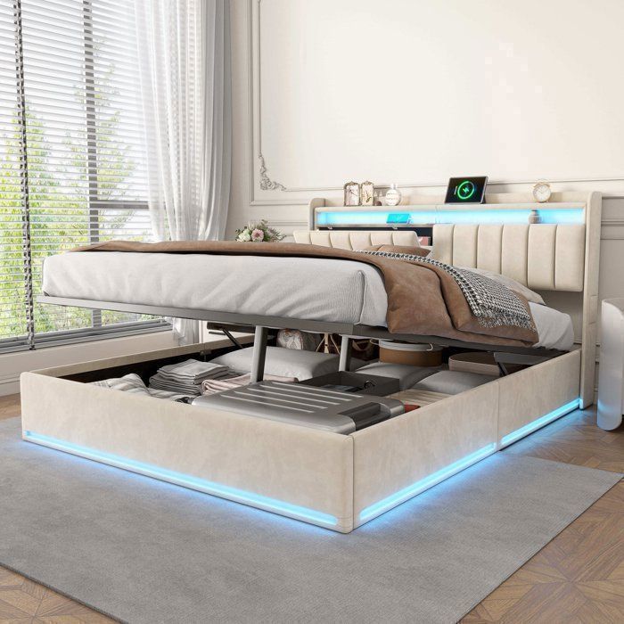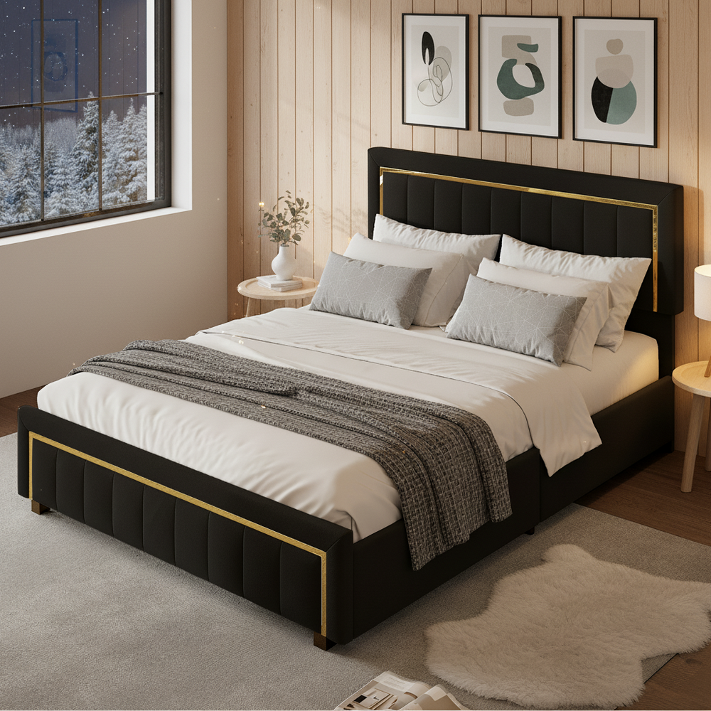 Confort et élégance réunis : Ce lit matelassé est conçu pour offrir un confort optimal grâce à sa tête de lit verticaux, parfaite pour la lecture ou pour se détendre. Montage facile et assurance qualité : Des instructions de montage claires (français non garanti) et une inscription claire des composants rendent le montage facile même pour les débutants. Lit Coffre Rangement Lit 2 Personnes Avec Coffre De Rangement Et Tête De Lit En Velours Beige Matelas Et Sommier 160x200 Solde EN STOCK : lit 2 Personnes 160 x 200 avec tête de lit et rangement sous le lit, lit coffre moderne avec tête de lit décorative à bordure dorée, cadre de lit... Les bordures dorées ajoutent une touche de sophistication à votre chambre, parfait pour compléter tout style d’intérieur. Description du produit Lit coffre avec bordure dorée - revêtement en velours Surface de lit en duvet beige, accompagnée de bords métalliques dorés, avec une tête de lit matelassée à rayures verticales qui dessine des lignes nettes, adaptée aux chambres à coucher modernes et au style chic et minimaliste, rehaussant instantanément l'élégance de l'espace. Nombre de sommiers : 12 Couleur : noir/beige Montage / montage partiel requis : oui Matelas inclus : non Poids du produit : 47 kg/49kg Outils nécessaires : tous les outils/tournevis sont inclus. Facilité d'assemblage avec instructions incluses : Ce lit double avec espace de rangement est facile à assembler grâce à des instructions claires et compréhensibles. Espace de rangement pratique sous le lit : Profitez d'un espace de rangement sous le lit astucieux, idéal pour optimiser l'espace de votre chambre. Esthétique de rangement invisible : Une fois fermé, la surface du lit est uniforme et l'espace de rangement est complètement dissimulé, préservant l'harmonie du design global. Ce lit double transforme votre chambre en une oasis de confort tout en apportant un design moderne et raffiné. Facile à entretenir et à nettoyer., Ask ChatGPT Lit coffre 160x200 en velours côtelé beige avec tête de lit et sommier... Ce lit avec coffre de rangement est plus fonctionnel que les lits traditionnels à tiroirs, vous permettant de stocker efficacement vos affaires sans encombrer la pièce. Structure robuste et stable : Fabriqué avec un cadre en métal robuste et du MDF haute densité, ce lit est capable de supporter jusqu'à 250 kg. Il reste confortable toute l'année sans provoquer de transpiration excessive, et offre une sensation de relaxation optimale lorsque vous vous appuyez avant de vous coucher. Lit coffre 160x200cm, lit double rembourré velours avec sommier à lattes et tête de lit en fil doré, beige