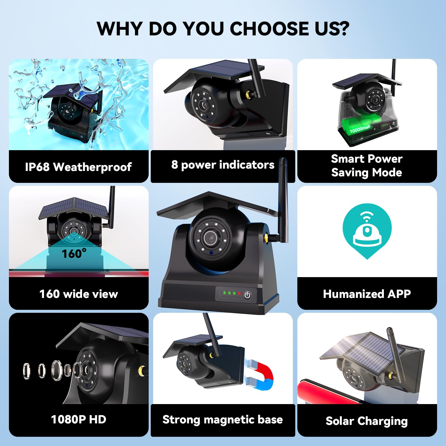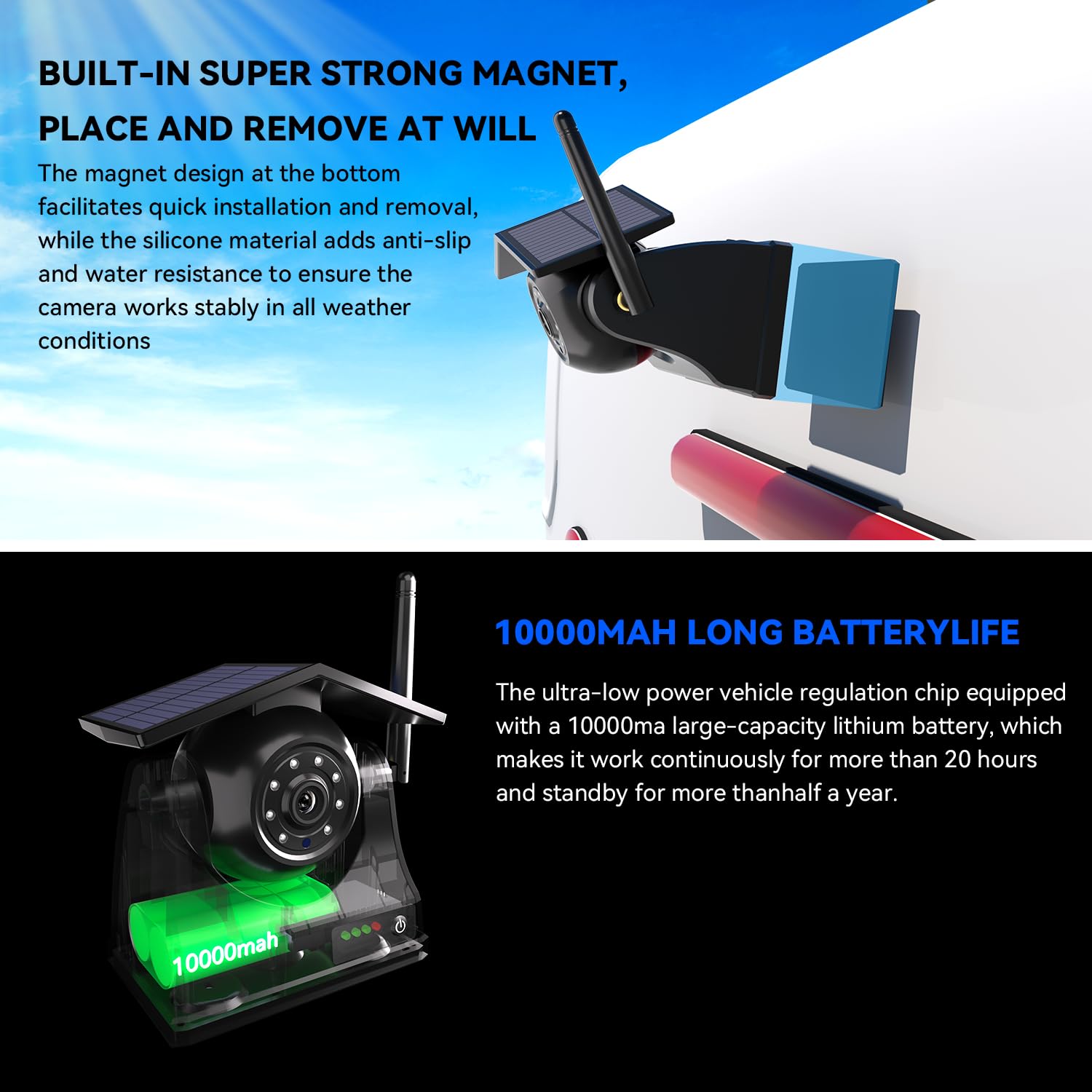 La connectivité robuste assure une surveillance fluide en temps réel et augmente la sécurité et le confort sur la route. Caméra Solaire Caméra De Recul Solaire Sans Fil VASTEND - 10000mAh Étanchéité IP67, garantit durabilité et durabilité. Camping Car Caméra De Recul WiFi Avec Système Solaire Magnétique Sans Fil 10 Caméra WiFi Magnétique 1080P Imperméable, résistant à la poussière et construit pour résister au froid/chaleur extrêmes, pour une fiabilité toute l'année. La fonction solaire permet un fonctionnement continu et est donc parfaite pour le pick-up, la remorque, etc. Caméra de recul-sans fil magnétique puissant pour remorque HD 1080P caméra solaire RV longue durée de vie de la batterie avec moniteur d'enregistrement de 7... 【Parfait pour le remorquage et le stationnement】 Cette caméra de recul solaire est spécialement conçue pour le remorquage de charges lourdes, camions, remorques de camping-car, tracteur, camionnette, SUV, voiture. La base magnétique puissante rend l'installation de cette caméra de sauvegarde sans fil un jeu d'enfant - Il suffit de la fixer à n'importe quelle surface métallique, pas de perçage, pas de câblage nécessaire. Système solaire magnétique - Asco 【Installation facile en 1 minute et base d'aimants puissants】Dites adieu aux configurations complexes Notre caméra de sauvegarde WiFi offre une installation sans effort en seulement 3 étapes simples : téléchargez l'application, établissez une connexion WiFi et regardez l'image sur votre téléphone ou votre tablette. Contenu : 1 caméra de recul solaire sans fil., 1 antenne., 1 plaque métallique. 【Caméra de recul portable rechargeable】La caméra dispose d'une capacité de batterie ultra grande de 10 000 mAh et prend en charge 2 méthodes de charge : charge solaire et charge de type C. Résistance aux intempéries selon IP68 : résistance de -20 °C à 60 °C. Huit LED infrarouges offrent une vision nocturne exceptionnelle et garantissent des images claires et détaillées même dans des conditions de faible luminosité.