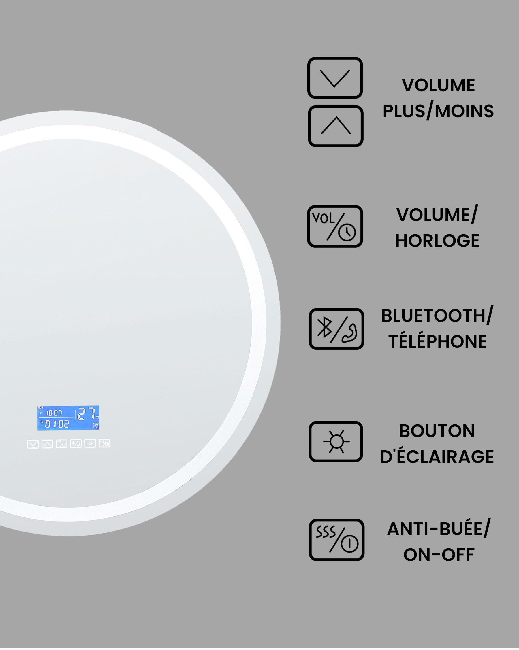 STARLEAD Carré Miroir LED Salle de Bain avec Éclairage 80x80cm, Bluetooth, Anti buée, 3 Couleurs Lumière, Gradable, Mémoire, IP44, Verre Trempé PROTECTION EAU : miroir mural idéal pour l'installation dans la salle de bains. Miroir Led Miroir De Salle De Bain 80x80 Éclairage LED à 360°, Bluetooth Miroir LED Avec Haut-parleur Miroir anti-buée pour une vision claire après la douche. Miroir simple de salle de bain Miroir anti-buée pour une vision claire après la douche. éclairage De Salle De Bain Miroir De Salle De Bain Jericho Avec Bluetooth 70x100 Cm Miroir Salle De... DESIGN : miroir de salle de bain au look moderne. Protégé contre les projections d'eau de tous côtés selon la classification de protection IP44., Convient aux pièces humides comme la salle de bains. Miroir LED peu encombrant et moderne. ANTI-BOUCHERIE : miroir de salle de bain avec fonction de chauffage intégrée contre la buée du miroir. COMMANDE : Miroir de salle de bain avec haut-parleurs Bluetooth intégrés. L'éclairage LED est réglable et commandé par un interrupteur tactile intelligent.