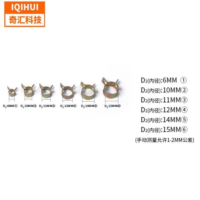 Colliers De Serrage à Ressort Collier De Serrage,Collier De Serrage En Silicone Pour Tuyau D Kit Serrage Mécanique Auto QUARKZMAN 10 Pcs Colliers De Serrage Pour Tuyau De Carburant YIXISI 250 Pièces 5-14 Clip à Ressort Tuyau, Clip à Ressort Tuyau Collier Serrage, Collier... Les colliers de serrage à ressort sont faciles à installer et à réutiliser. Apparence belle et lisse, conception de précision de l'anneau intérieur à 360°, bon étanchéité, connexion fixe du tuyau et du corps du tuyau est bonne. À quoi dois-je faire attention?Remarque: Lorsque vous choisissez un collier de serrage en plastique pour votre tuyau, assurez-vous que l'ID du collier Qu'est-ce que c'est?Ce collier de serrage pour tuyau de carburant a une large gamme d'utilisations et est utilisé pour serrer et sceller les interfaces. Surface: Revêtement de zinc noir Matériau: Acier à ressort 65 Mn; Dans l'emballage: 10 Pcs x 14 mm Collier De Serrage À Ressort Pour Tuyau Le collier de serrage est fabriqué en acier à ressort 65MN, qui peut résister à la corrosion et à la rouille dans la plupart des environnements et est durable. Vous avez seulement besoin d'appuyer fort sur la languette du collier pour agrandir l'anneau intérieur, vous pouvez le mettre dans le tube rond, puis le relâcher, vous pouvez le serrer, et il est plus pratique à utiliser avec le collier et peut être utilisé à plusieurs reprises. Ce collier de serrage pour tuyau de carburant a une large gamme d'utilisations et sert à serrer et sceller les interfaces. Il est très adapté pour les conduites de carburant automobiles, tuyaux d'eau, tuyaux d'air, tuyaux à vide, conduites de gaz, tuyaux en silicone, machines-outils, lutte contre les incendies, divers équipements...