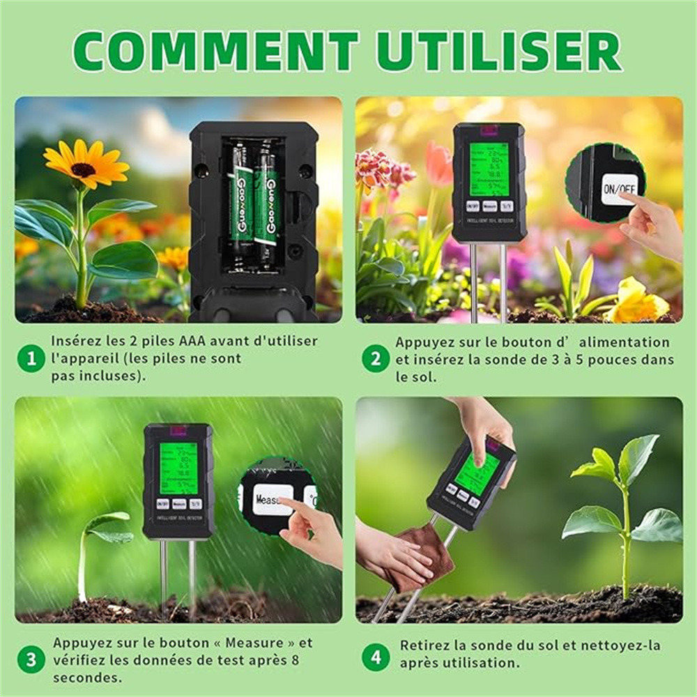 Vous pouvez choisir un environnement d'humidité et de température plus adapté à vos plantes en fonction des résultats. La plage de mesure de l'humidité du sol est de 0 à 100 %, et la plage de température de l'air est de -20 °C à 60 °C. Après utilisation, veuillez essuyer le capteur pour éviter d'affecter la précision des mesures lors de la prochaine utilisation. Précision et fiabilité : Le capteur de haute qualité garantit des mesures précises et est adapté pour une utilisation intérieure. Tolesum Testeur d'Humidité du Sol 4-en-1, Thermomètre Facile à utiliser : Ajoutez le produit à l'application Smart Life sur votre téléphone, insérez le capteur d'humidité dans le sol, attendez 1 à 2 minutes pour consulter les résultats du test. L’appareil sera ajouté automatiquement une fois détecté., Appuyez sur « Terminé »., 6., Insérez la sonde aux deux tiers environ dans le sol, attendez 1 à 2 minutes et consultez les données sur votre smartphone., 7., Nettoyez la sonde après utilisation pour garantir des mesures précises la prochaine fois. Surveillance précise du sol : obtenez des lectures précises de l'humidité et de la température du sol, des conditions optimales pour que vos fleurs et... Inclus dans le colis : 1 x Testeur d'humidité et de température du sol - Bleu et noir (SGS01Z) 1 x Manuel d'utilisation Description: Instructions : 1., Téléchargez et installez l’application Smart Life., 2., Ouvrez l’application, créez un compte ou connectez-vous avec un compte existant, puis commencez à configurer l’appareil., 3., Activez le Wi-Fi et le Bluetooth pour passer en mode appairage. Un excellent outil pour entretenir un jardin sain. Testeur Humidité Température Capteur D'hygromètre De Sol De Moniteur D'eau De Plante De Mètre D'humidité De Sol Pour Le Capteur Humidité Sol Testeur d'Humidité du Sol 4-en-1]Le testeur d'humidité du sol 4-en-1 est un outil polyvalent pour le jardinage, l'agriculture et l'entretien des plantes d'extérieur. Il combine quatre fonctions en un seul appareil : la mesure de l'humidité du sol, de la température, du pH et de l'intensité lumineuse du soleil. Il est le compagnon idéal pour vos fleurs et plantes [Grand Écran et... Ce produit nécessite un usage avec une passerelle Zigbee.