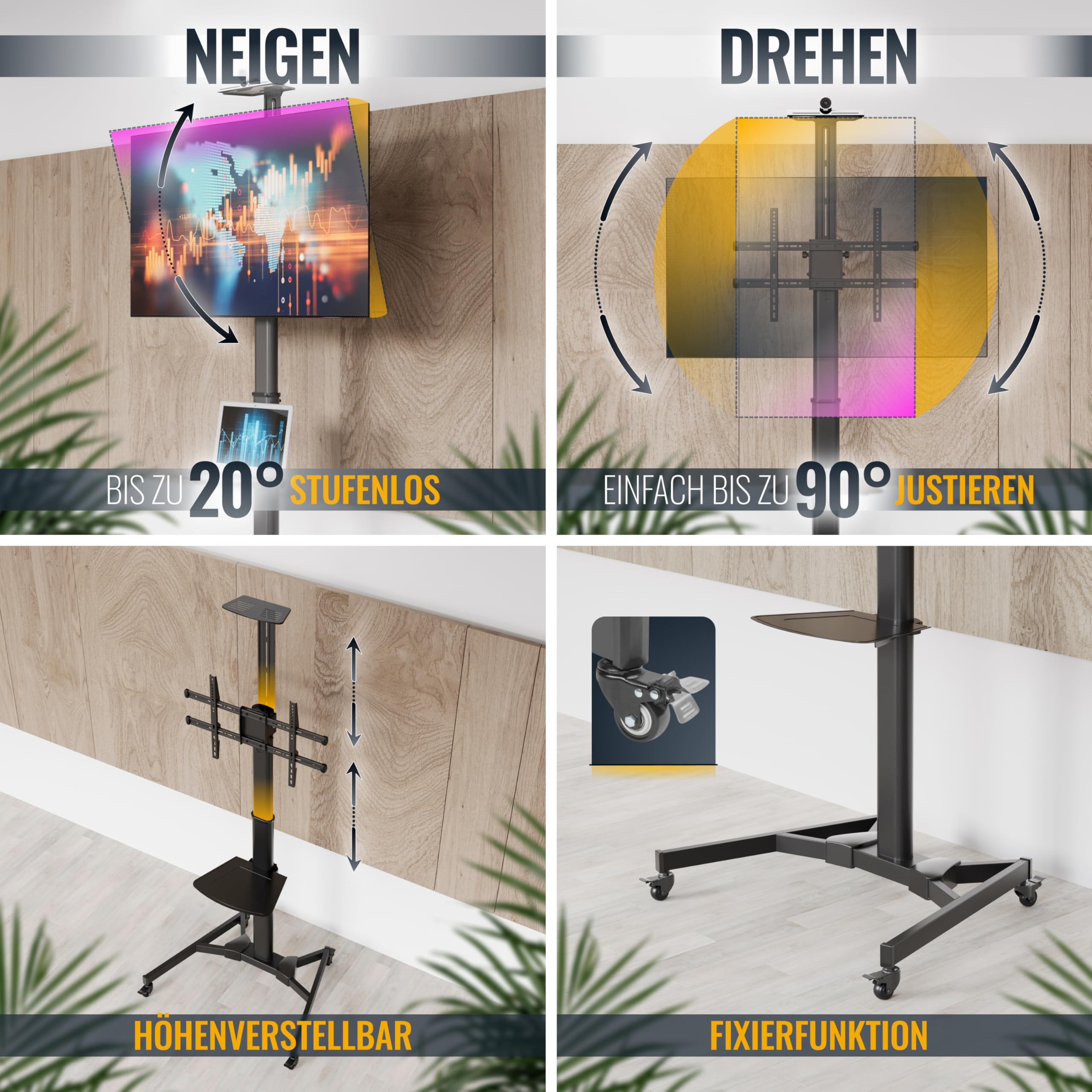 Design d'écran rotatif à 90° : ce support TV peut être tourné à 90° sans outils, de sorte que vous pouvez facilement regarder la télévision sur l'écran horizontal et regarder de courtes vidéos sur l'écran vertical pour répondre à différents besoins. Pied Universel Pour Tv AOKCOS Support De Sol Pour TV - Roulable - Avec étagère En Bois - Avec Tele Portable Sur Pied Compatibilité et universalité : ce support de sol pour téléviseur est adapté à la plupart des téléviseurs et moniteurs de la plupart des marques de 19 à 42 pouces et pesant jusqu'à 15 kg. jusqu'à 20 kg, Chariot TV Mobile Réglable en Hauteur, Max VESA 200x200mm pour la Salle de Réunion et la Maison · 4,54,5 sur 5 étoiles (1,8 k). Plus de 50... Pour vous assurer que vous obtenez la meilleure vue possible. Base en X peu encombrante et stable : la longue face avant et l'arrière court de la base en forme de X réduisent le risque de basculement vers l'avant et augmentent la stabilité du support de télévision en métal. Il supporte les écrans de 43 à 75 (jusqu'à 50kg) avec une base en bois chic et des roulettes pratiques. La hauteur s'ajuste de 130 à 162cm, et l'angle s... Angle d'inclinaison et hauteur réglables : l'angle d'inclinaison de ce support TV peut être réglé entre -2° et +10°. Compatible avec les trous VESA de 75 x 75 mm à 200 x 200 mm. En outre, il s'adapte plus étroitement au mur sans prendre trop de place. Support Pied Tv pas cher - Meilleures ofes neuf et occasion Ainsi, vous pouvez déplacer le chariot TV d'un endroit à un autre silencieusement et en douceur et fixer la position debout. 【2 Gestions de Câbles & Montage Rapide】Nous vous proposons 2 façons de gérer les câbles : vous pouvez les passer à travers le tube ou les fixer derrière le tube avec un support de câble pour mettre de l'ordre dans votre maison.