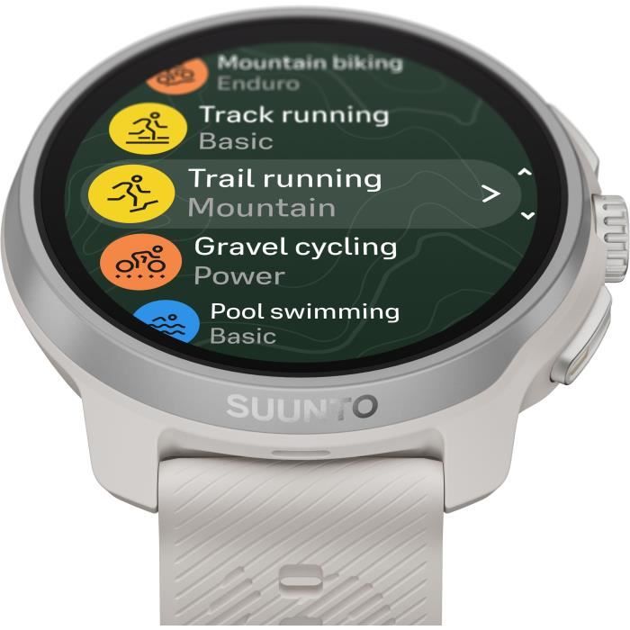 Que vous vous entraîniez pour votre prochaine course, ou que vous cherchiez à équilibrer votre vie et vos récupérations, la Suunto Race 2 vous apporte confiance, résilience et préparation pour être performant quand cela compte Montre Trail Running Cardio SUUNTO Race 2 Montre De Sport Homme Femme, Tracker D Polar H10 La Suunto Race 2 est conçue pour les athlètes courant sur de longues distances, que ce soit pour le trail, l’endurance ou simplement se dépasser jour après jour avec détermination Découvrez Race 2 : la montre de performance par excellence avec un écran AMOLED lumineux de 1,5 pouces, plus de 115 modes sportifs, des cartes hors lignes et jusqu’à 55 heures d’autonomie La batterie dure jusqu’à 16 jours pour une utilisation quotidienne et jusqu’à 55 heures dans le mode d’entraînement GPS optimisé, ce qui vous permet de rester concentré sur vos efforts plutôt que sur la recharge Au-delà des performances, la Race 2 est conçue pour être portée au quotidien, avec des cadrans personnalisables, des bracelets confortables et des matériaux légers, lui permettant de s’intégrer à vos journées en toute transparence. La Race est parfaite pour les activités outdoor: suivez vos pics de puissance lors de vos sorties à vélo, la reconnaissance automatique des intervalles... En matière de progrès à long terme, Suunto Coach propose des conseils d’entraînement intelligents et évolutifs adaptés à vos objectifs La Race 2 est conçue pour vous accompagner à chaque étape : de vos entraînements structurés à vos courses, en passant par votre récupération et votre vie quotidienne. Utilisez-la pour contrôler votre musique, vos podcasts ou vos livres audio au niveau de votre casque, et pour suivre votre activité quotidienne et votre sommeil Suunto Race Pas Cher SUUNTO Race S Montre GPS Sport AMOLED - Bi Les athlètes pratiquant l’endurance apprécieront les fonctionnalités avancées de plein air, notamment le GPS double bande précis et les outils tels que ClimbGuidance, qui aident à garder le cap et le contrôle sur les terrains techniques. Avec les futures mises à jour, les nouvelles fonctionnalités et l’extension des capacités via l’application Suunto, votre montre continuera de vous en offrir plus au fil du temps