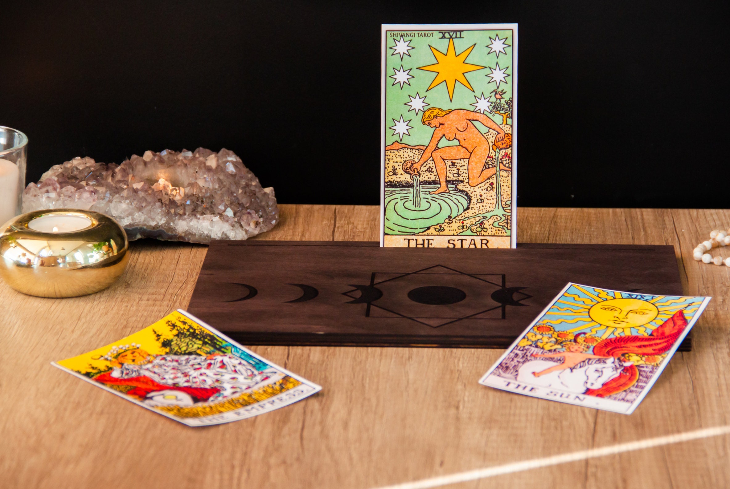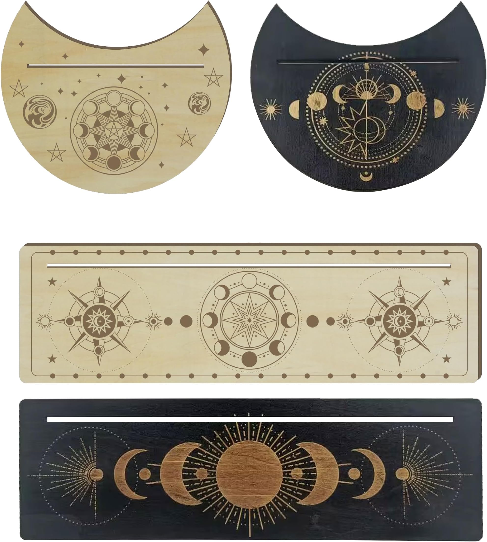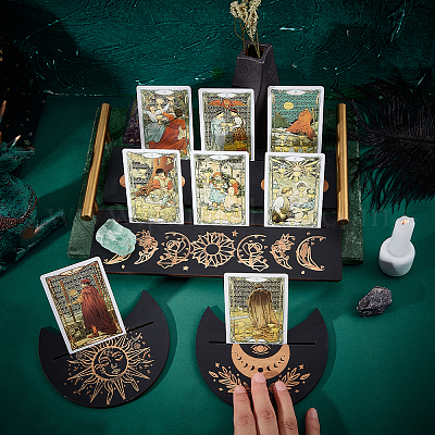 Motif Lune étoiles Déco ésotérique 10 Carte De Tarot En Bois De 5 Styles En Gros Pour Création De Bijoux Jeu De Tarot Il peut être utilisé comme un présentoir exquis de cartes de tarot, fournissant une plate-forme de placement rituelle pour les amateurs de divination de tarot, ou il peut être utilisé pour afficher une collection de cartes souvenirs, des cartes postales d'art, des photos, etc. comme une touche décorative unique Rangement pour cartes de tarot et Oracle Deck pour plusieurs jeux Taille:Ce présentoir à cartes mesure environ 28x13x1., 8cm /11x5x0., 7 pouces, facile à transporter et à déplacer, pratique pour vous de changer l'emplacement à tout moment en fonction de vos besoins, que ce soit pour l'affichage quotidien des cartes, ou une utilisation temporaire lors de fêtes et d'événements, c'est très approprié Ce support se distingue par son design finement sculpté en phases de lune, qui ajoute une dimension éthérée à vos rituels de tarot. Chaque phase de la lune, du... Cadeau idéal:ce présentoir de cartes unique et mystérieux est idéal pour un anniversaire, Noël, Halloween et autres festivals comme cadeau pour votre famille et vos amis qui aiment collectionner des cartes et aiment décorer pour exprimer votre cœur 2 Conception à fentes:Ce présentoir à cartes avec phases de lune, étoiles et autres motifs de surface, qu'il soit placé dans votre maison ou votre studio, cela peut être une décoration frappante, créant une atmosphère mystérieuse et élégante. La conception à 2 rangée de fentes vous permet de placer plus de cartes, à la fois beau et pratique Taille:Environ 28x13x1., 8cm /11x5x0., 7 pouces.