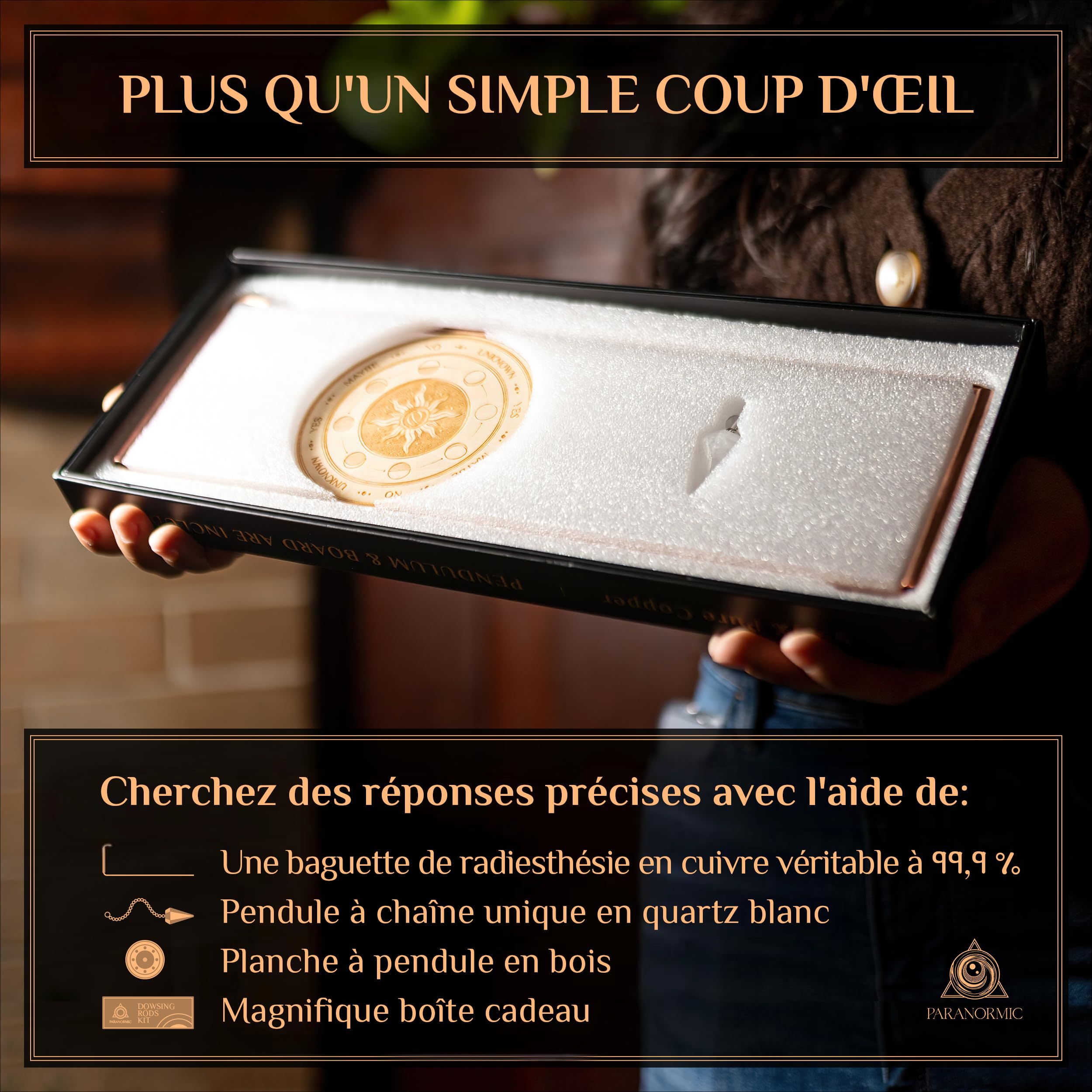 Design facile à transporter : avec des tiges télescopiques qui se replient pour le stockage et le transport, ce kit peut vous accompagner lors d'exploration en plein air ou de voyages, prêt chaque fois que vous sentez l'appel pour vous connecter avec des énergies invisibles ou chercher des réponses. Accessoires Radiesthésie Complet Pendule Tapis Ensemble De Tiges De Radiesthésie En Cuivre à 99,9 % - Kit De Plaque De Outil Métaphysique énergie Chasse Fantômes Caractéristiques : * *Matériaux : *2 tiges de radiesthésie télescopiques pour pendentifs en cristal. Pendule Égyptien Isis-Osiris - Gunmetal - 6 plaques/résonateurs, 2... C : 2 tiges de radiesthésie + 1 paire de gants. Outil de divination professionnel : fabriqué à partir de 99,9 % de cuivre pur, ce kit psychique de radiesthésie offre une conductivité et une réactivité exceptionnelles pour diverses pratiques de divination, vous permettant d'explorer le royaume métaphysique en toute confiance. Pendule conique cuivré - Achat / Vente pendule divinatoire Pendule... B : 2 tiges de radiesthésie + 1 pendentif + 1 tapis + 1 paire de gants. Caractéristiques : * Nom de la pièce : sonde en cuivre., * Matériau : 99,9 % cuivre. Kit d'exploration complet : le colis comprend des tiges de radiesthésie télescopiques, un pendule, un tapis de divination et des gants de protection – tout ce dont vous avez besoin pour les débutants et les praticiens expérimentés pour commencer leur voyage vers la radiesthésie et la détection d'énergie. Pendule Témoin en métal, cuivre - Pendule divinatoire/Laiton - Miracles Contenu de l'emballage : A : 2 sondes télescopiques + 1 pendentif. Utilisations multiples : ces outils de radiesthésie en cuivre peuvent aider à localiser les sources d'eau, les minéraux, les objets perdus, mener des consultations d'âme et améliorer les relations interpersonnelles grâce au travail énergétique, ce qui les rend polyvalents à la fois pratiques et spirituelles.