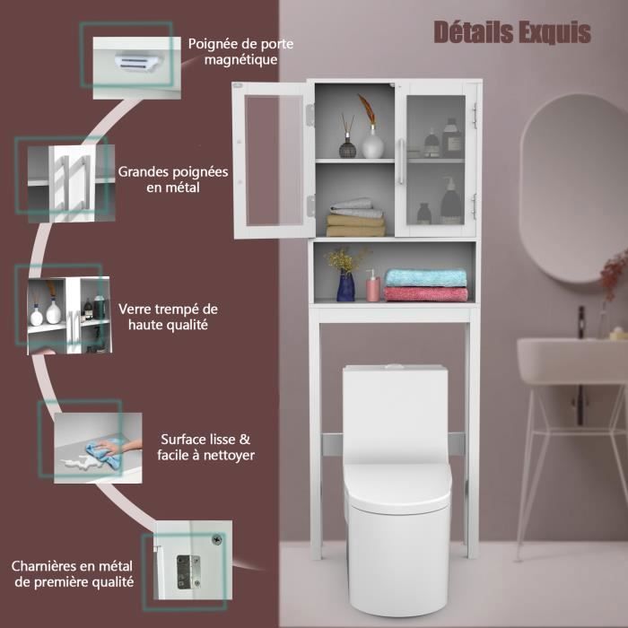 Étagère Wc, Rangement Au-dessus Des Toilettes, 3 Niveaux, Avec 【S'adapte à Vos Besoins】Le cabinet au-dessus des toilettes offre 5 réglages de hauteur pour les 3 étagères, retenant facilement des articles de tailles variées. Meuble Sur Pied Wc COSTWAY Meuble WC Au-dessus De Toilettes, Porte En Rotin PE, Etagères De Rangement Ouvertes Et Reglables 89 X 29 X 139 Cm Meuble Rangement Wc 【Économiseur d'Espace à 3 Niveaux】Notre organisateur de salle de bain gère efficacement vos serviettes, articles de toilette ou fournitures de blanchisserie avec ses étagères à 3 niveaux et 3 crochets amovibles. Ainsi, ce meuble de rangement pour toilettes autoportant est idéal pour la salle de bain, la buanderie et les toilettes. [Installation et maintenance faciles : ]livré avec des accessoires complets, ce placard de rangement au-dessus des toilettes n'est pas si difficile à assembler COSTWAY Meuble WC au-Dessus des Toilettes, Rangement de Salle de Bain à... 【Unité de Rangement Polyvalente】L'étagère inférieure des 3 niveaux de rangement peut être ajustée vers le haut, assurant un espace suffisant en dessous pour que le couvercle de la toilette s'ouvre entièrement sans être bloqué. La barre inférieure s'ajuste de 11 cm à 25 cm, pour ne pas interférer avec votre disposition de plomberie ou d'aménagement mural. Elle est également suffisamment spacieuse pour les machines à laver ou les paniers de linge et peut même servir de support pour plantes. La barre inférieure est également réglable, assurant un ajustement propre pour toute configuration murale. De plus, les patins de pied réglables permettent à l'étagère de rester équilibrée sur des sols légèrement inégaux, augmentant sa stabilité. 1Besoin d'un rangement astucieux pour votre salle de bain compacte ? Notre étagère de rangement en bambou pour salle de bain est la solution parfaite, comportant 3 étagères ajustables et 3 crochets pratiques, positionnés juste au-dessus de vos toilettes.