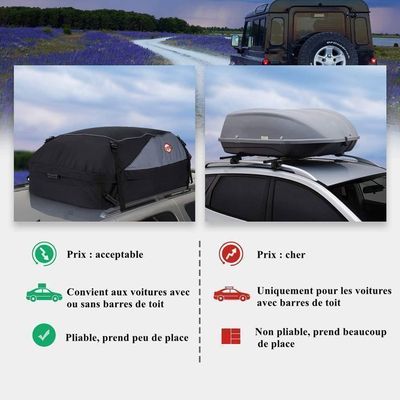 Caractéristiques principales : installation adaptable : peut être utilisé comme sac de toit de voiture avec ou sans barres de toit existantes, avec sangles réglables pour différents types de véhicules. Sac de transport pour toit de voiture, 4,6 m³, très résistant, 100 % étanche, convient à toutes les voitures avec/sans rack, comprend un tapis antidérapant, 8 crochets de porte, un sac de Peut servir de rangement temporaire lors des déménagements à domicile ou des rotations saisonnières d'équipement. Bagage Toit 4.6 M³ SUV Break Sac De Toit Imperméable De 4,6 M³ Avec Tapis Antidérapant Et Verrou Rangement Supplémentaire Voyage Le design se concentre sur la simplicité et l'adaptabilité pour divers véhicules et besoins de voyage. Construction résistante aux intempéries. Ohuhu – Porte-bagages de toit iperéable de 0,6 ³ avec tapis... Performance résistante aux intempéries : la forme résistante au vent et le tissu à séchage rapide peuvent bien fonctionner dans les climats britanniques variables Caractéristiques : Dimensions déplié : 112 x 86,4 x 43,2 cm (L x l x H)., x86x4 3 cm). Pour éviter de surcharger votre véhicule et voyager en toute tranquillité, le sac de toit représente une solution pertinente. Nous avons testé pour vous le sac de toit imperméable de 4,6 m³ afin d’évaluer sa praticité et sa fiabilité. Dès la réception du colis, la compacité du produit surprend Design prêt à voyager : éléments réfléchissants sur les sangles pour améliorer la visibilité, tandis que le profil bas de 43,2 cm peut éliminer les restrictions de hauteur. Construction : tissu Oxford imperméable avec coutures scellées pour protéger le contenu de la pluie lors des changements météorologiques britanniques. Suggestions d'utilisation : pensez pour les vacances en famille lorsque vous avez besoin d'espace supplémentaire pour les bagages. Solution de rangement pratique sur le toit : ce sac de toit polyvalent peut fournir un espace supplémentaire lorsque vous avez besoin de transporter des bagages supplémentaires, du matériel de sport ou du matériel de camping. Solution de rangement peu encombrante : se replie dans un sac de transport inclus (30,5 x 20,3 cm) lorsque vous ne vous en servez pas ; la capacité de 4,6 m³ peut contenir 4 à 5 valises ou du matériel de camping comme des tentes ou des sacs de couchage.