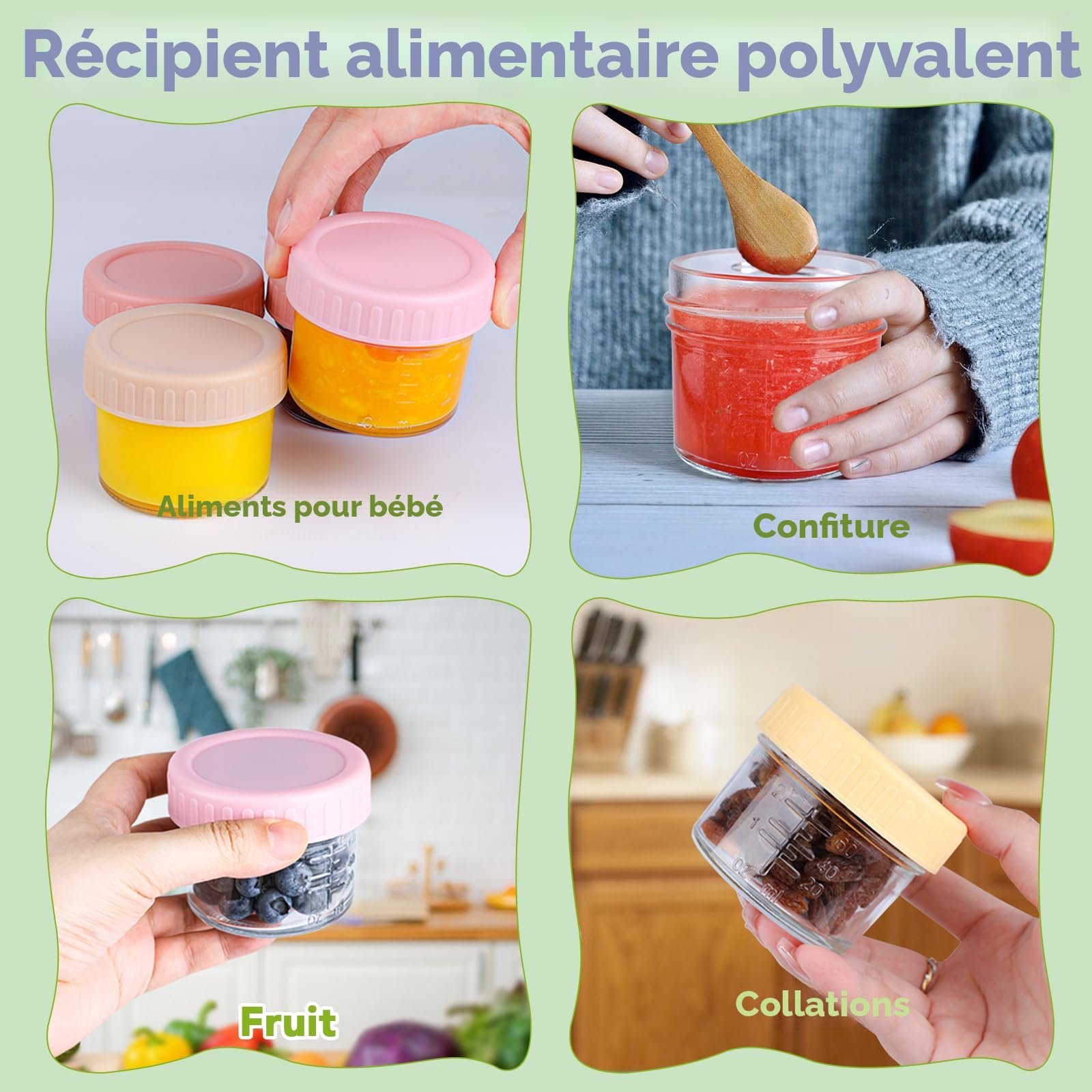 Conteneurs Purées Bébé Sécurité Récipients Deli Avec Couvercle Pour Conservation Des Aliments - Étanche Récipients Alimentaires Bébé Boîtes de rangement pour aliments en verre borosilicaté avec couvercles ESSENTIEL DE CUISINE MULTIFONCTIONNEL] Au-delà du stockage des aliments, ces récipients peuvent être utilisés pour cuire à la vapeur des aliments pour bébé, cuire des crèmes aux œufs ou servir des collations.Le verre résistant à la chaleur fonctionne parfaitement dans les fours et les micro-ondes, tandis que la conception allant au... Dimensions du produit : environ 10 x 7,5 cm., Poids : environ 250 g. Âge recommandé : bébés de plus de 4 mois. Robuste et résistant à la température : avec une construction en silicone et verre de qualité alimentaire, ces récipients polyvalents pour bébé garantissent une utilisation sûre dans les micro-ondes et les congélateurs tout en maintenant la durabilité contre les changements de température Les bocaux et bols réutilisables dans ces récipients alimentaires pour bébé garantissent un stockage sécurisé des purées, des salades et des collations pour les enfants et les tout-petits. Alimentation sûre et sûre : équipés de poignées résistantes à la chaleur et d'un design de protection contre les brûlures, ces récipients alimentaires pour bébé assurent une manipulation facile des aliments chauds tout en offrant des poignées sécurisées et des poignées en silicone antidérapantes pour plus de sécurité et de commodité pendant le repas Système Smart Baby Food : simplifiez la préparation, le stockage et le réchauffage des aliments pour bébé avec un récipient compatible avec le cuiseur vapeur qui passe au micro-ondes, au congélateur et au lave-vaisselle pour un confort idéal Caractéristiques de protection des bords arrondis : équipés de couvercles étanches et de pare-chocs en silicone, ces récipients alimentaires offrent des bords arrondis et sûrs, sans odeur pour les besoins alimentaires de bébé Stockez le lait maternel et les repas de bébé en toute sécurité. CANPOL BABIES 4 POTS DE CONSERVATION DES ALIMENTS 180ML 0M . congélateur, micro-ondes