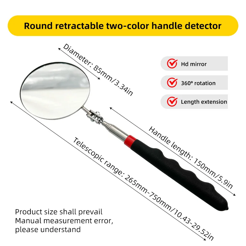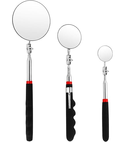 Les miroirs peuvent pivoter librement tout en maintenant n'importe quelle position souhaitée pour une meilleure inspection des zones difficiles d'accès. Rotation à 360 degrés : ajustez les miroirs d'inspection avec facilité à l'aide de la rotule rotative à 360 degrés, vous donnant une plus large gamme d'angles... Solide et exquis : ce miroir d'inspection est fabriqué en acier inoxydable, qui a une forte ténacité et une bonne durabilité. En raison de la mesure manuelle, il peut y avoir une erreur dans la taille du produit. 360° LED Miroir D'Inspection Dentaire Avec LED Lumière, 2 Pièces Miroir Dentaire Avec La Lumière, Miroir Miroir Télescopique Son matériau solide garantit qu'il n'est pas facile à casser et la tige télescopique peut s'étendre. Caractéristiques : Nom du produit : miroirs d'inspection. Caractéristiques puissantes : ce miroir d'inspection permet une exploration sans effort des zones difficiles d'accès. Il ne se casse pas facilement et a une finition exquise. Sa prise en main confortable permet une navigation facile dans les espaces sombres, ce qui en fait un incontournable pour les professionnels et les amateurs. Merci de votre compréhension. Rotation à 360 degrés : ajustez les miroirs d'inspection avec facilité à l'aide de la rotule rotative à 360 degrés, vous donnant une plus large gamme d'angles de vue. Miroir d'inspection Flexible rond, outil d'... – Grandado Contenu : 1 miroir d'inspection. Inspectez sans effort avec facilité, ce qui permet d'économiser beaucoup d'énergie et de temps. Miroir d'inspection sous véhicule, Miroir convexe de 30,5 cm avec roues