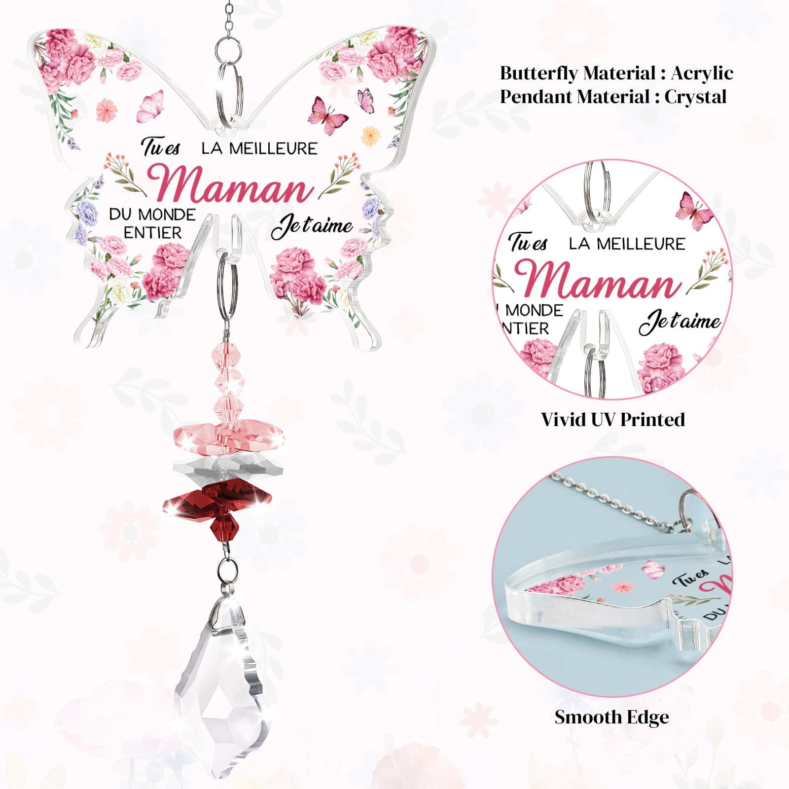 Taille du papillon : 97,5 cm. Cet ensemble attrape-soleil exquis est un excellent cadeau pour grand-mère Les petits-enfants peuvent exprimer leur amour et leur... Léger : Le produit ne pèse que 51 g et l'emballage 68 g. Après une impression UV soignée, le texte sur le papillon est visible, donnant au produit une émotion et une signification uniques. 【 Une réflexion de la beauté de la nature 】 Notre cadeau de suspendeur de soleil est inspiré par la beauté et la grâce des papillons. Que ce soit pour un anniversaire, Noël, un mariage, une réunion familiale ou toute autre occasion, il s'agit d'une façon attentionnée de commémorer ces moments et de montrer à vos proches combien vous les aimez. PRÉSENTATION DU PRODUIT : Ce pendentif attrape-lumière en cristal en forme de papillon est un cadeau créatif alliant esthétique et praticité. Il symbolise la transformation, la croissance et la résilience de la nature. Jazlyvex Cadeaux pour femmes, cadeau d'anniversaire pour petite amie, maman, femme, sœur, cadeaux de Noël 20 30 40 50 femmes 【 Un symbole émouvant de l'amour 】 Ce suspendeur de soleil en cristal en forme de papillon est gravé de messages touchants qui expriment vos sentiments les plus profonds. MATÉRIAUX ET PROCÉDÉS DE FABRICATION DU PRODUIT : Matériaux : La partie papillon est en acrylique de haute qualité, transparent et brillant, imitant le cristal avec une grande résistance et une excellente résistance aux intempéries. Attrape-soleil Cadeau Femme Cadeau Maman, Cadeau Anniversaire Maman Idee Original Femme Fete Des Meres, Coffret Cadeau Maman, Tasse Isotherme Cadeau Pour Maman,Meilleure Amie,Cadeaux Maman Femme 30 40 50 60 Ans Pendentif Décoratif Acrylique Cadeau Son poids plume facilite le transport et la portabilité, sans ajout de poids gênant pour l'utilisateur. Procédés de fabrication : La partie papillon utilise une technologie UV avancée pour l'impression. Que vous l'utilisiez pour vous-même ou comme cadeau pour vos proches, il ajoutera une touche de couleur à la vie. L'attrape-soleil personnalisé en verre capte la lumière et la transforme en éclats colorés. Un objet artisanal parfait pour embellir fenêtres et jardins Lorsque votre ami le verra, il se souviendra de votre amitié et du lien spécial qui vous unit. Cela garantit que les textes et motifs ne s'estomperont ni ne se détacheront pas facilement même après une longue utilisation. Notre équipe professionnelle est toujours prête à intervenir tout au long de votre expérience d'achat, prête à fournir une assistance complète et attentive, et nous nous engageons pleinement à rendre votre parcours d'achat et de cadeau agréable et sans souci. C'est un rappel concret que même lorsque vous n'êtes pas physiquement présent, votre amour et votre soutien sont toujours avec lui. La technologie UV permet de rendre les textes et motifs imprimés colorés et riches en nuances, avec une forte adhérence et une excellente résistance à l'abrasion. 【 Service de qualité toute compris 】 Nous utilisons un emballage dans une boîte élégante et prenons des mesures exhaustives pour garantir le transport en toute sécurité du produit, en nous assurant qu'il arrive dans un état parfait.