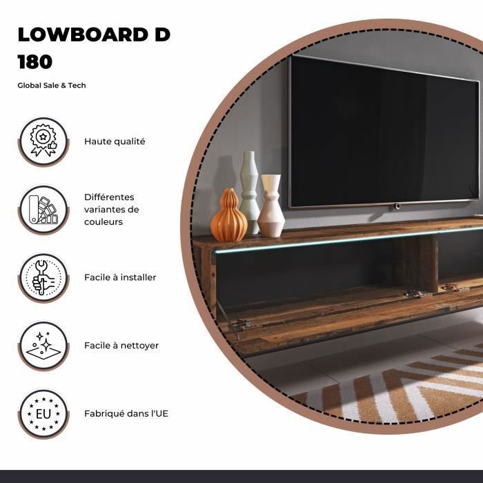 Merax Lowboard mit LED und Klapptüren, freistehend/hängend, TV-Schrank 【Meuble TV suspendu】 Le design flottant du meuble TV facilite le nettoyage, évitant le problème courant de l'accumulation de poussière sur les modèles traditionnels. Meuble TV Suspendu Meuble TV à Design Suspendu WALNUT 180 Cm - Salon Moderne Meuble Tv 180 Cm Largeur 【Haute qualité】 Le meuble TV est fabriqué en panneaux de bois massif de haute qualité, avec un style moderne et minimaliste, à la fois élégant et durable. Meuble TV Lowboard D180 Blanc/Gris brillant, Nombre de portes : 2... Meuble TV / Meuble de salon - Lowboard A- 300 cm - Chêne Kastan Breslau... Su capacidad de carga máxima es de 200 kg, asegurando seguridad y estabilidad. En même temps, le design avec des coins arrondis prévient les chocs, assurant la sécurité et ajoutant une touche moderne. 【Taille pratique】Le meuble TV mesure 180 x 30 x 20 cm et est équipé de deux tiroirs et d'un compartiment indépendant avec couvercle, répondant ainsi aux besoins de stockage quotidiens. Méfiez-vous des bords tranchants. 【Fácil de instalar】El mueble de TV ya está preensamblado, por lo que se puede colgar directamente en la pared al recibirlo, sin necesidad de montaje. Avertissement De Sûreté Attention : ne pas dépasser 200 kg.