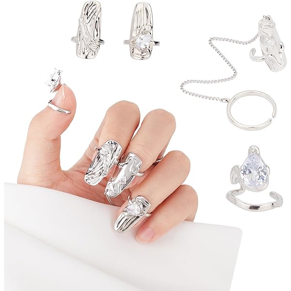 NICENEEDED 4pcs Bagues à Ongles pour Femmes, Accessoires de Charmes D'Art D' Ongle D'Ouverture Réglable, Strass Doigt Couverture Décoration Armure Anneau Ongle Protection Ongle Cadeau pour Femmes Fill - Utilisation polyvalente : peut être utilisé comme une breloque pour ongles ou une bague punk ouverte, pour diverses occasions et styles d'anneau de bouchon d'ongles. Anneaux Protection Ongles Argent DesignB London - Lot De 2 Bagues En Métal Effet Dégoulinant - Argenté Bague Phalange Argent - Couleur : bijoux en argent. Cette bague est fabriquée en alliage de zinc de qualité, elle peut bien former une griffe de bague de fête. - Ajoutez ces bagues tendance, simples, vintage et... Ensemble de 2 bagues assorties de mariage avec lettres personnalisées... Multifonction : cette bague fonctionne à la fois comme une breloque à ongles et une bague punk ouverte, adaptée à différents événements et styles, porter des ongles, griffe du bout des doigts en métal - Taille : 2,70 x 1,10 x 1,10 cm - Bagues pour ongles pour femme. Matériau ferme : fabriqué en métal, l'anneau résiste à la déformation et permet de le porter sans endommager vos ongles, bague punk rock, bijoux punk Caractéristiques : - Matériau : anneau en métal. Faux anneaux de faux ongles fabriqués à partir de métal, ces bagues de bout de doigts présentent un design élégant et avant-gardiste qui combine une esthétique d'inspiration ancienne avec un style punk moderne Contenu du colis : 2 anneaux de protection pour ongles.