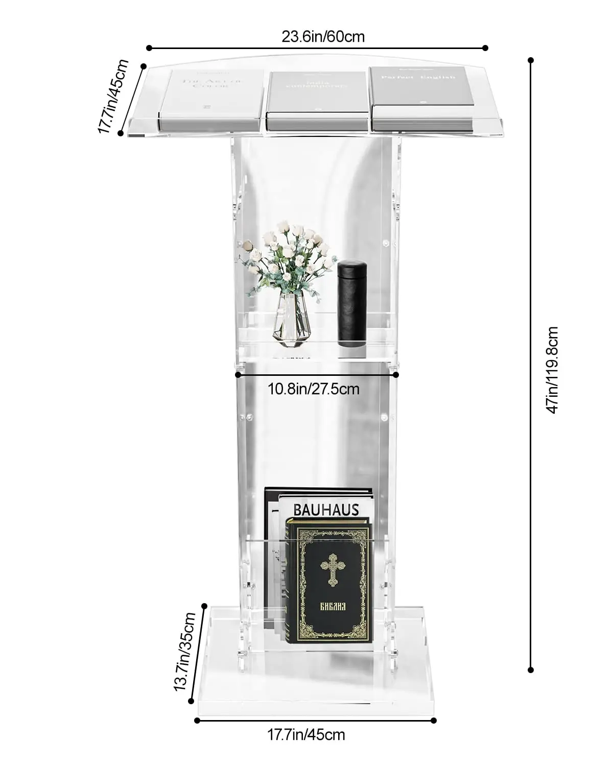 Incliné de manière ergonomique, 40 x 40 cm, il améliore le confort de lecture et offre de la place pour différents objets, ce qui vous permet de vous déplacer librement sur scène. Avec la télécommande fournie, vous pouvez facilement basculer entre 4 modes de flash et 15 couleurs. Avec les instructions ci-jointes, la configuration peut être terminée en moins de 10 minutes. Disposition de présentation généreuse : notre bureau d'église LED offre un plateau spacieux et lisse avec une butée en feuille pour assurer une lecture sûre. FixtureDisplays Podium En Bois Avec Panneau Avant En Acrylique, Pupitre De 46 Po De Hauteur X 24 Po De Largeur X 16 Po De Profondeur Fxtu6847 Options d'éclairage dynamique : contrairement aux pupitres traditionnels, nos pupitres et podiums offrent un éclairage d'ambiance LED réglable. Facile à entretenir avec un chiffon humide. FixtureDisplays Pupitre de pupitre en acrylique transparent de 43 po de... Nombreuses utilisations dans différents environnements : avec des colonnes cylindriques en acrylique et un design en croix creuse, ce pupitre a été spécialement conçu pour les églises. Une fois assemblé, il atteint des dimensions de 39,4 L × 17,7 l × 44 H (100 × 45 × 112 cm). Montage et portabilité faciles : le montage de la chaire d'église est un processus rapide qui ne nécessite que quelques plaques acryliques et vis. Petite Etagere Présentoir Luxueux De Pupitres D'Église, Plate-Forme De Lecture Verticale, Salle De Discours En Acrylique Pour Prêtre Et Prêtre, Pupitres D'Église, Plate-Forme De Lecture Verticale D'Église (Clair Plateau Incliné 40x40 Cm Le plateau lisse dispose d'une butée en papier pour garder vos matériaux sécurisés tout en étant incliné pour une lecture optimale. Avec des dimensions de 50 x 30 cm, il peut accueillir divers articles, améliorant vos présentations sans effort Il est équipé de 4 roulettes qui garantissent une mobilité facile, et 2 roulettes disposent de freins pour assurer la stabilité pendant l'utilisation.