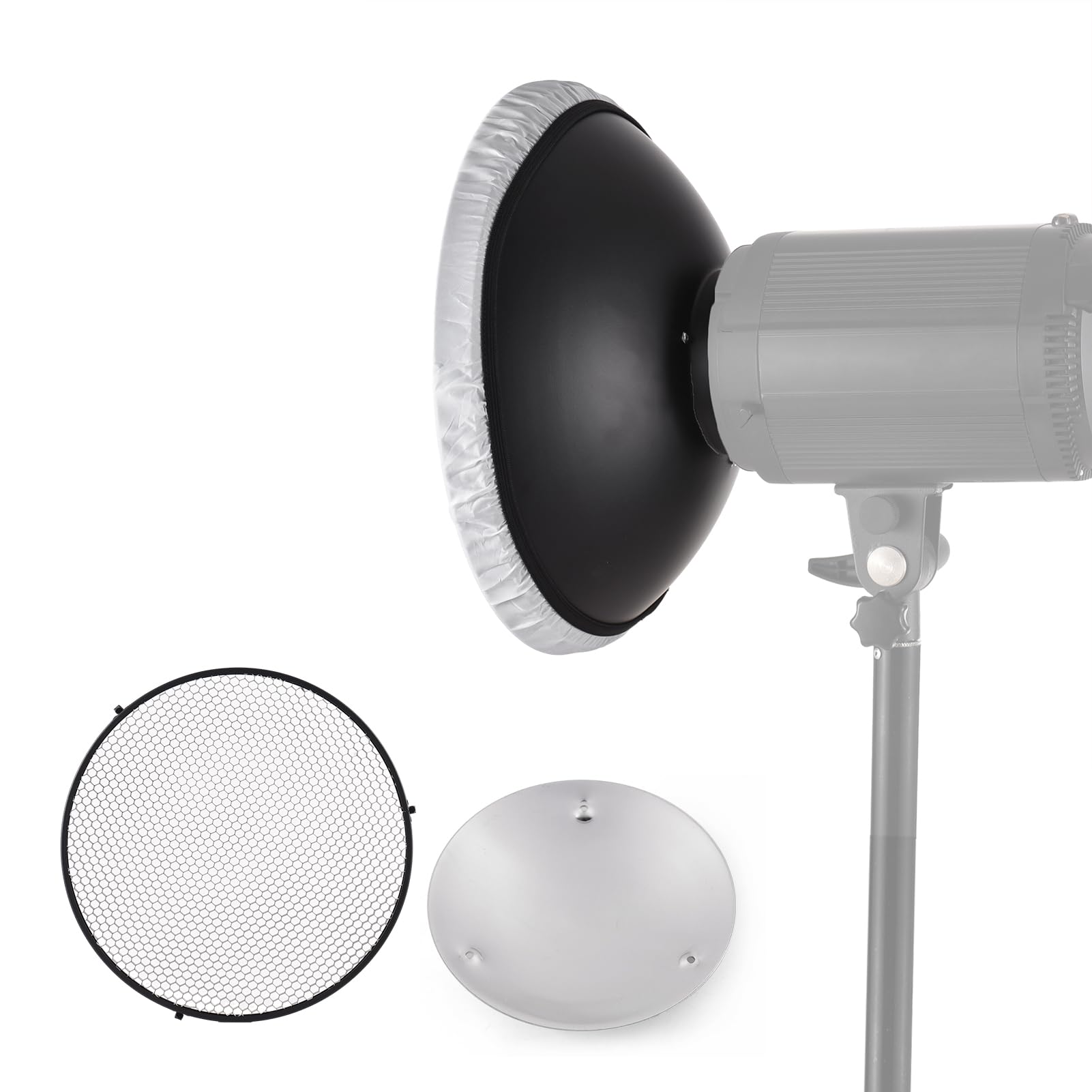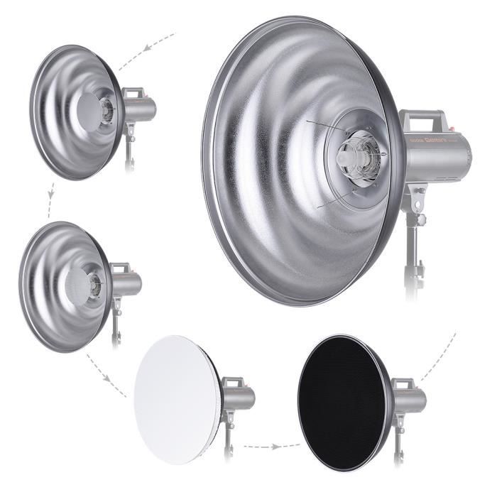 Tapez 20 40 60 Diffuseur de lampe à réflecteur Standard de 7 pouces Reflecteur Radiateur Andoer Diffuseur De Lampe Réflecteur Standard Avec... Grille Nid D'abeille Diffuseur Grille Photo Andoer Bowens Mount Beauty Dish Diffuseur D'abat-jour Grille Nid D'abeille Beauty Dish 30 Cm Fit: pour Bowens Mount Studio Light Diamètre de montage : 95 mm. 1 grille en nid d'abeille., 1 x chaussette diffuseur., 1 réflecteur central Réflecteur diffuseur - Godox - 7 pouces - Aluminium - Grille en nid d... Taille de l'article : 300 x 140 mm. Le réflecteur standard, structuré en aluminium, a un diamètre d'environ 30 cm. Le panneau réfléchissant central inclus garantit un éclairage plus uniforme, adapté aussi bien aux profils verticaux lumineux que doux. Ce réflecteur est largement compatible pour la photographie de portrait et de studio, ainsi que pour la réalisation de vidéos, offrant un effet d'éclairage plus doux.