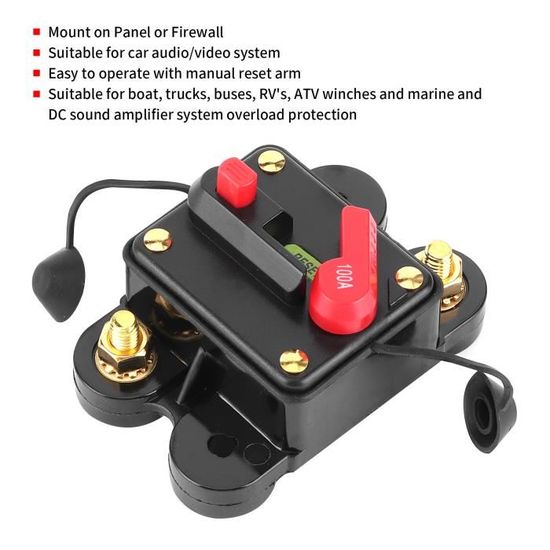 Disjoncteur DC Disjoncteur 12-24 V CC 100 A Réinitialisation Manuelle Calibre 0-8 Moteur à La Traîne Audio Stéréo De Voiture Porte-fusibles En Ligne Onduleur Pour Automobile, Camping-car, Bateau (100 A Disjoncteur 16a Disjoncteur De Voiture 30A - 150A, DC 12V - 48V Disjoncteur Etanche Avec Reinitialisation Manuelle Pour Moteur Auto Voiture Marine Bateau Velo Stereo Audio 150a 91733923 Fusibles,Disjoncteur,avec réinitialisation manuelle,pour voiture,bateau,protection d... Pas besoin de remplacer les fusibles, le système peut être réinitialisé par un simple interrupteur qui offre également un arrêt sûr et instantané du système. Spécification: Tension: DC 12 V - 24 V Courant: 30 Amp Fil de jauge de combinaison: 0-4 AWG Température de fonctionnement: -32 ° C à 82 ° C (-25 ° F à 180 ° F) Le package comprend: 1x disjoncteur 30A Remarque: 1., Veuillez appuyer correctement sur le bouton pour éviter d'endommager le disjoncteur., 2., Veuillez commander et utiliser le disjoncteur avec la bonne température de travail, pour éviter qu'il fasse trop chaud et arrêter le travail., 【Réinitialisation manuelle】 Le levier de réinitialisation visible indique une condition ouverte, une réinitialisation unique du bouton-poussoir Peut également être utilisé comme coupe-circuit. Lorsque le système est en surtension ou en court-circuit, le disjoncteur coupe et enregistre votre équipement. Le bouton du disjoncteur peut servir de sectionneur principal pour les circuits Également utilisé dans les charges de batterie et le système audio CC Desserrez un peu les vis. Spécification : disjoncteur étanche compatible avec tous les systèmes 12 V/48 V CC. Fonction : protège toujours la sécurité de l'électronique automobile, empêche les courants de voiture d'être trop élevés et d'endommager l'équipement électronique automobile