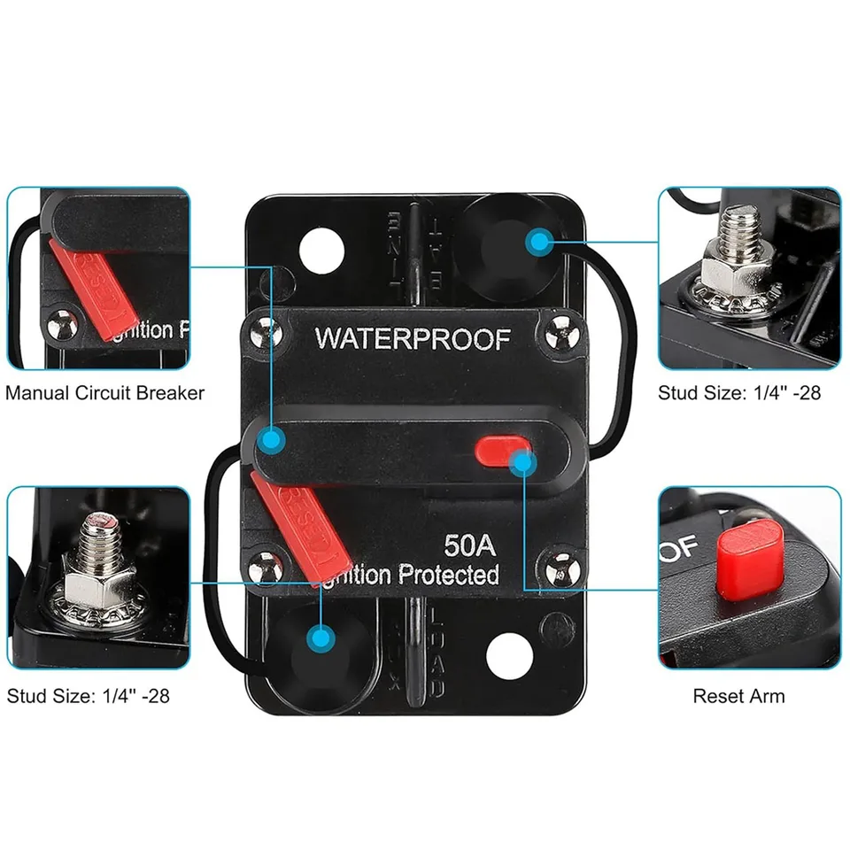Changan-fusible de voiture Disjoncteur universel de fusible de circuit Solution fusible de haute qualité : Conçu pour une utilisation professionnelle et DIY, ce disjoncteur polyvalent offre une large gamme d'applications allant de l'automobile aux environnements marins. Il remplace parfaitement les fusibles à lame standard avec une fonctionnalité améliorée Sécurité électrique Voiture Camping-car Dilwe Disjoncteur AMP Disjoncteur 60A AMP Support De Réinitialisation Circuit électrique étanche Bornes de courant élevé intégrées. Dur: Conception de la réinitialisation manuelle: Bouton de réinitialisation manuelle, le bouton rouge du disjoncteur peut être utilisé comme sectionneur principal du circuit, et peut également être utilisé comme coupe-circuit. Fusibles,Disjoncteur avec interrupteur,réinitialisation manuelle... Précis: Sûr et pratiquee: Carte de câblage à courant élevé intégrée, haute sensibilité, boîtier étanche de haute technologie, avec couvercle de boulon de protection en caoutchouc, peut protéger des dommages électriques, vous épargnant le coût de remplacement du fusible. Convient: Calibre de fil: Accepte un cordon d'alimentation de spécification 0/2/4/8, avec adaptateur, entrée de câblage (BAT) entrée, sortie (AUX) sortie. Pratique: Matériel: Plastique, Acier Zinc Alliage; Dimension: 7., 4x5., 5x4., 9cm / 2., 91x2., 17x1., 93(L*W*H). S'installe sur le panneau ou le pare-feu.