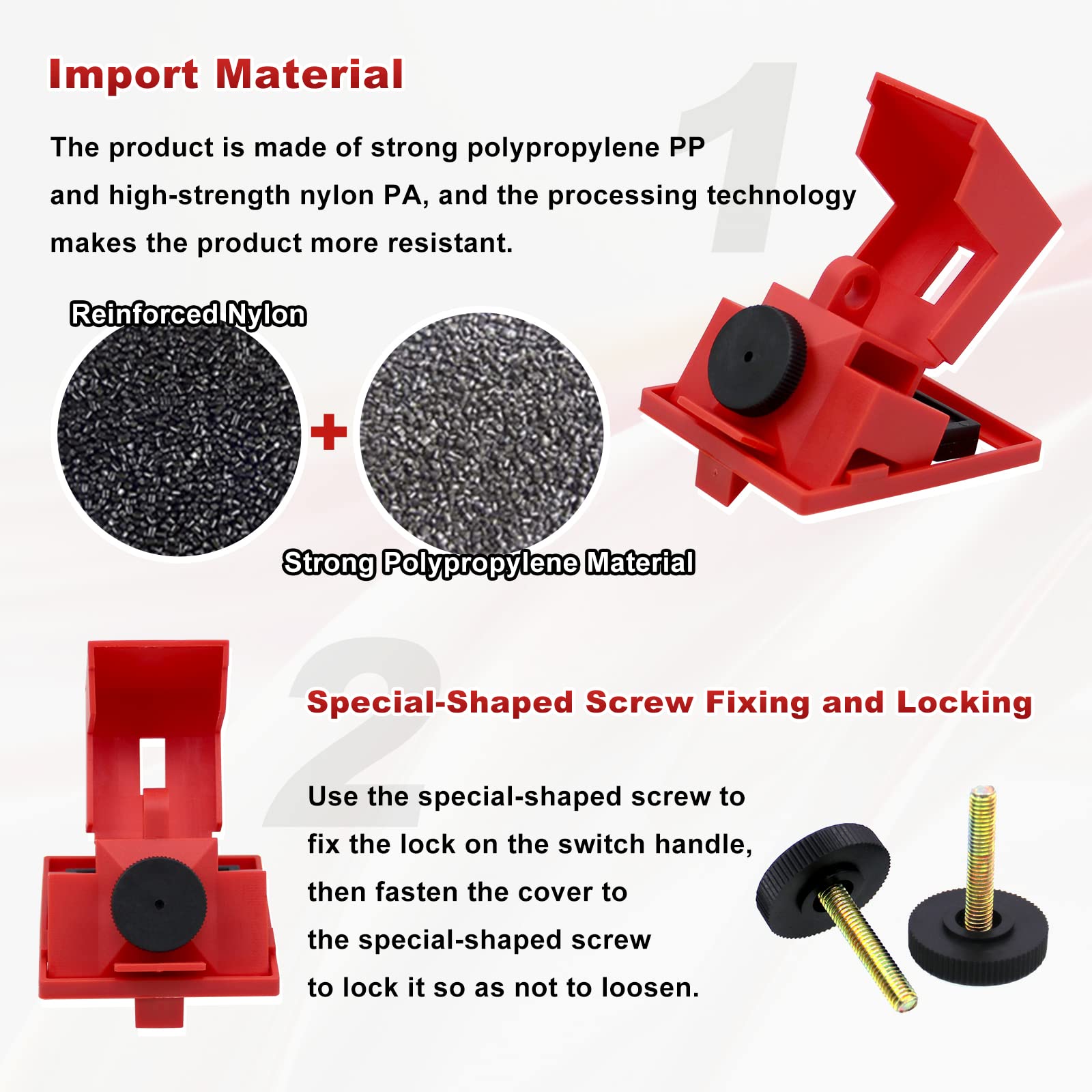 Kit de sécurité comprenant un rouge pour disjoncteur, un trou pour isolé et une étiquette, garantissant ainsi la disponibilité permanente de plusieurs points de consignation. Schneider Electric 27145 | C60 - dispositif de condamnation pour Verrou Disjoncteur Pince Dispositifs De Condamnation De Disjoncteurs Pince Locks Note: réflexion de lumière et différents écrans peuvent causer la couleur de l'article dans un peu différente de la vraie chose. à clip sécurisée Conçue avec un mécanisme de clip pour une installation sans effort sur les poignées de disjoncteurs de service moyen (largeur ≤ 41 mm). Dispositif de verrouillage de disjoncteur à pince 3PCS Interrupteur de... Conçu pour une fiabilité à long terme dans les usines, les ateliers et les centrales électriques. Fonctionne sur la plupart des disjoncteurs à pince 480/600 V. Installation sans outil et polyvalence Comprend une vis à oreilles en acier inoxydable avec un bouton en nylon pour un réglage et sans outil, ce qui le rend idéal pour diverses applications industrielles. Assure une prise stable pour éviter tout retrait accidentel, gardant l'énergie dangereuse isolée pendant la maintenance.