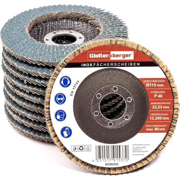 Disque à Poncer Lot De 10 Disques à Lamelles En Inox Bleu Grain 60 - 125 Mm Disques Abrasifs Métal Bois DISQUE 125 mm 22 mm A LAMELLE BGS DE 60 - SARLAT OUTILLAGE Lot De 10 Disques À Lamelles En Inox - Diamètre : 125 Mm X 22,23 Mm... Avantages pour l'utilisateur : - travail silencieux, haute efficacité d'usinage, - progression rapide du travail, - meulage froid Pour un nettoyage agressif de la rouille et des soudures, pour enlever les anciennes peintures et peintures, nettoyer le béton, la pierre. Utilisation : poncer en acier noir, enlever la peinture des plaques d'acier sans les rayer, enlever la rouille et la saleté de différents éléments métalliques, - Ponçage des soudures après le soudage, - Nettoyage des surfaces en bois et en plastique - Nettoyage et polissage de tous types de surfaces. Logement d'arbre : 22,23 mm de diamètre Un disque à lamelles polyvalent pour le ponçage du métal, du bois et en particulier des surfaces. Domaines d'application : pour dérouiller grossièrement le métal, enlever les anciennes couches de peinture, lisser le bois grossier, etc. Disque de ponçage pour meuleuse d'angle 125 Disques à lamelles pour le ponçage, le ponçage des surfaces et des bords Disque lamelle 125 mm grain 40, 60 et 80, bombé ou plat, zirconium de qualité industrielle avec un excellent rapport qualité prix pour métaux ferreux et non ferreux. Ailettes abrasives pour acier carbone et aciers inoxydables